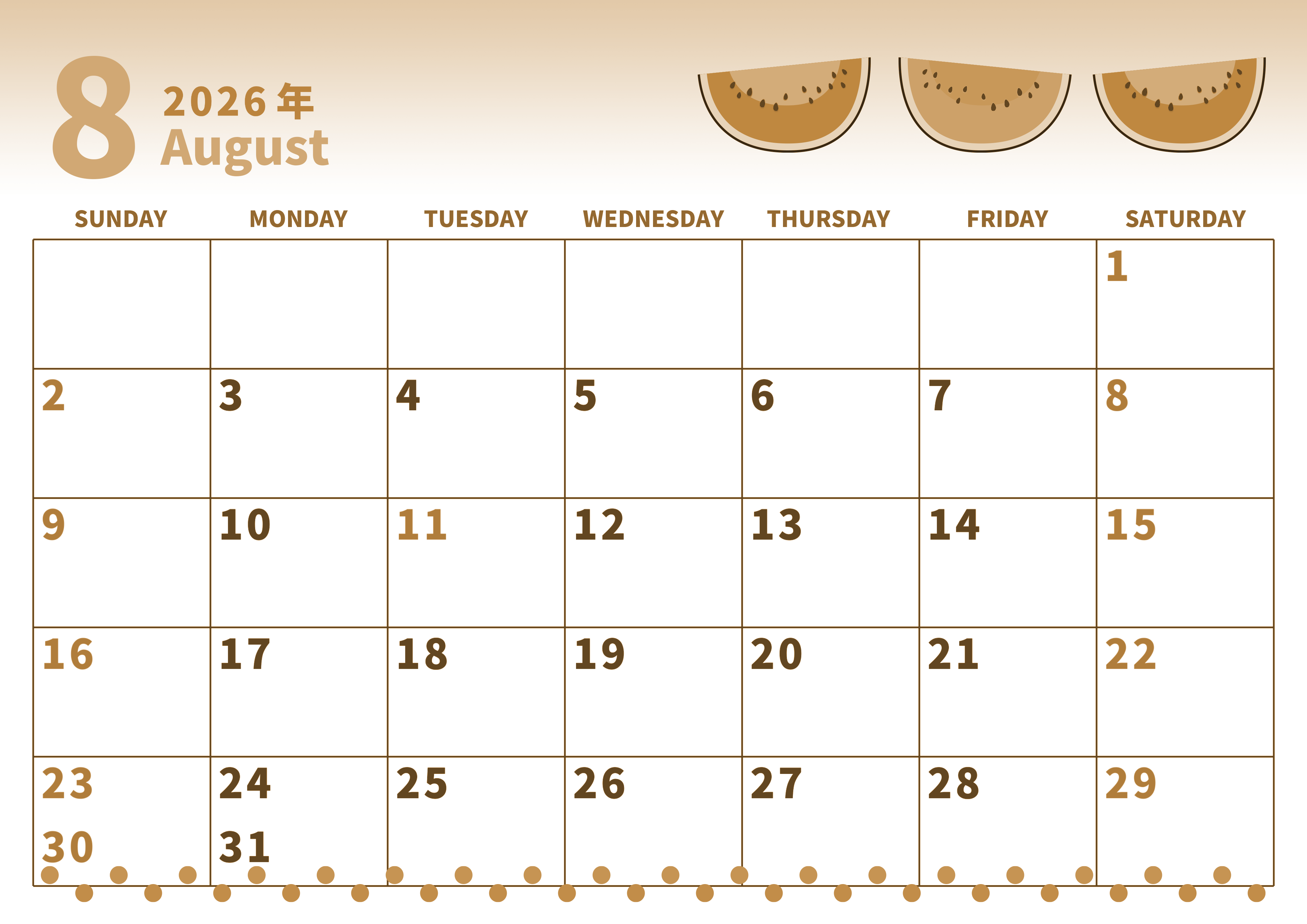 2026年・無料のカレンダーテンプレート 2026年8月横型レトロな日曜始まり スイカのイラストがかわいいA4無料セピア調カレンダー(2026-00540800) 素材状デザイン王 2025年4月2日 2026年8月横型レトロな日曜始まりの無料テンプレートセピア調カレンダーです。スイカとスイカが描かれているかわいいイラストセピア調カレンダーはお気軽に無料にてダウンロード利用をして頂ける素材です。(2026-00540800) 8月 横型のカレンダー 日曜始まり セピア カレンダーデザイン-0054