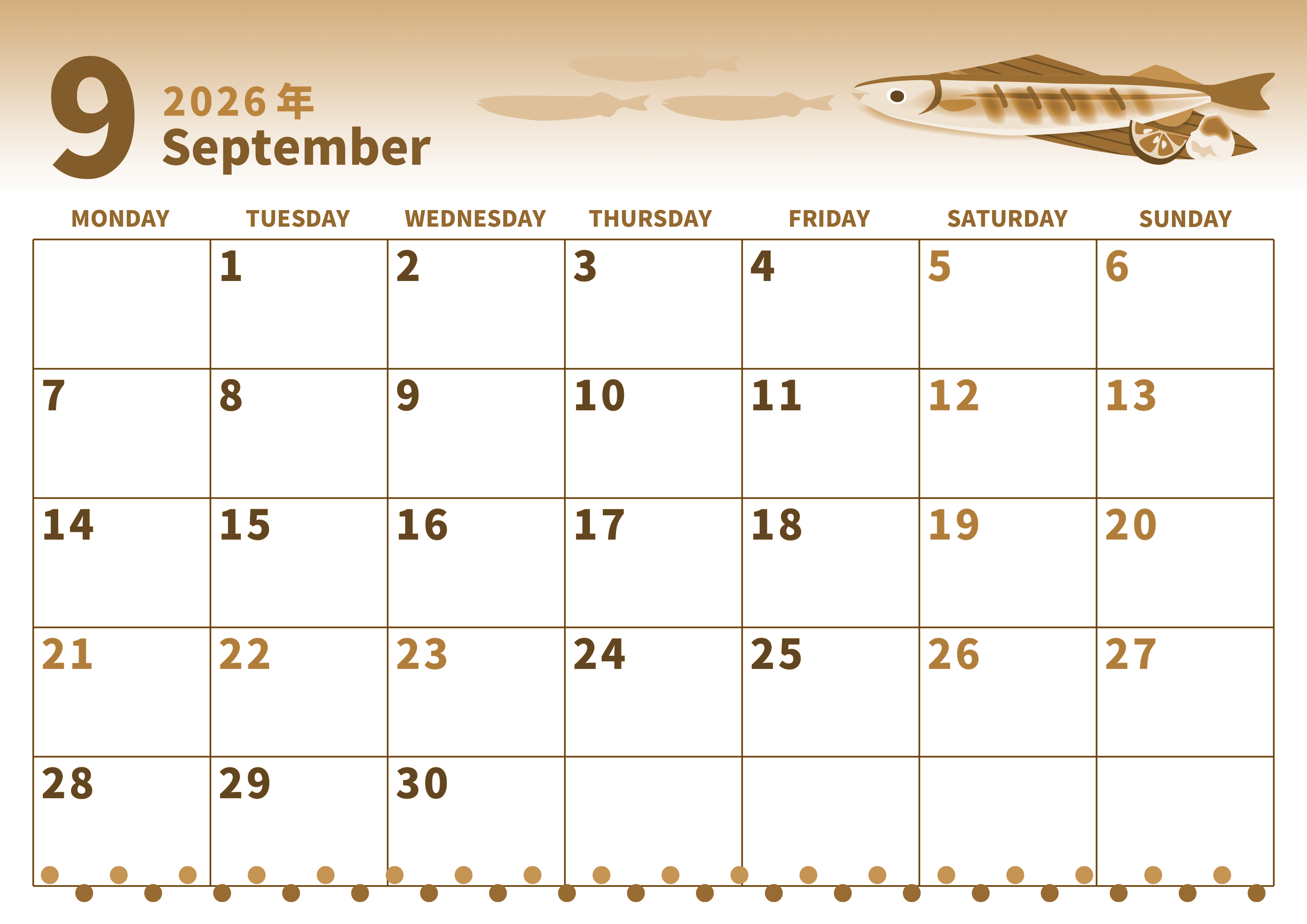 2026年9月横型レトロな月曜始まりの無料テンプレートセピア調カレンダーです。月曜始まりで文字の色分けが曜日によってなされているので計画を管理し易いレイアウトのセピア調カレンダーです。イラストはおいしそうな焼き秋刀魚です。(2026-00540901)