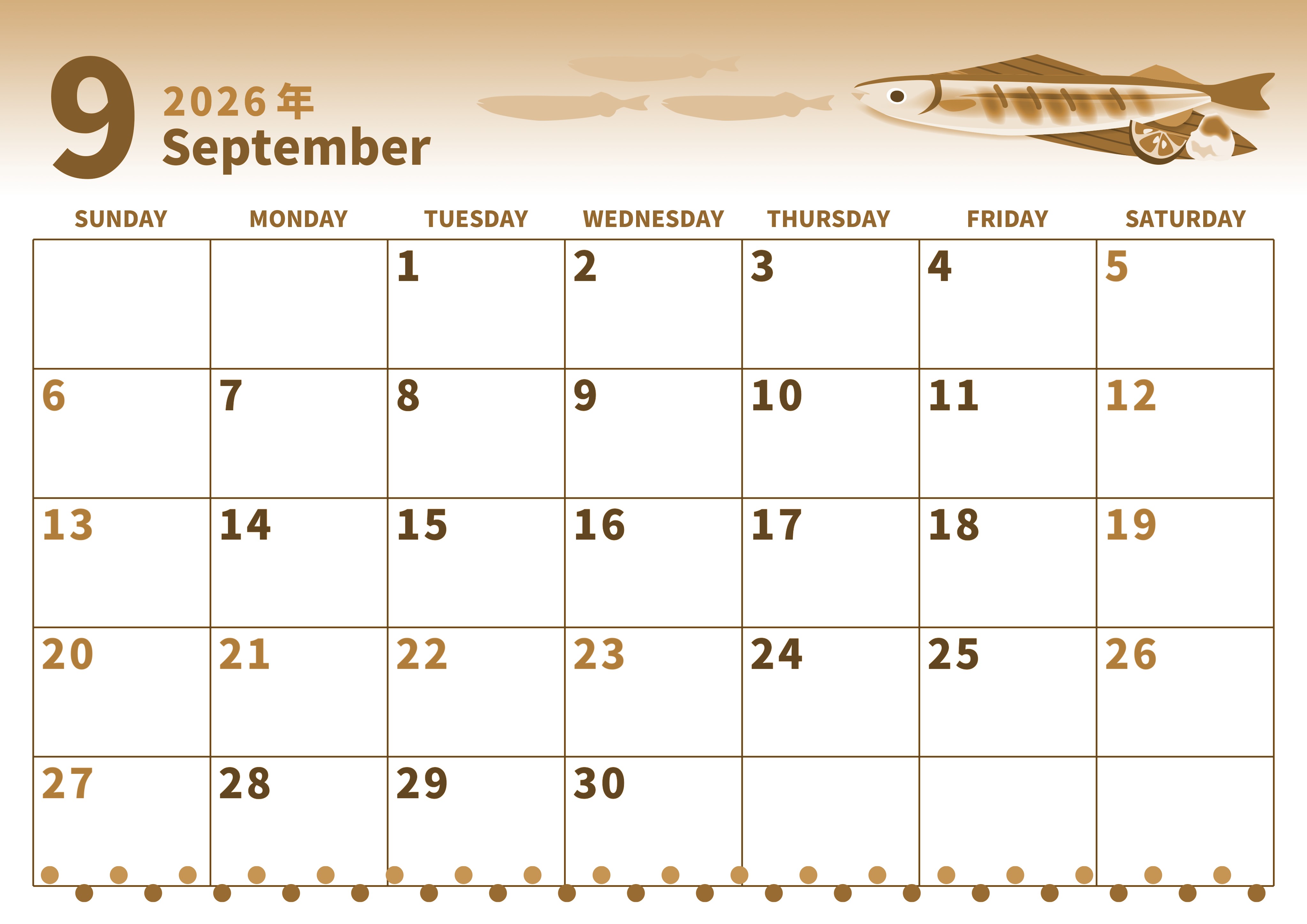 2026年9月横型レトロな日曜始まりの無料テンプレートセピア調カレンダーです。焼き秋刀魚のおいしそうな香りが漂ってきそうな食欲の秋を主題にしたかわいいイラストです。セピア調カレンダー部分は罫線が引いてあるので見やすいです。(2026-00540900)