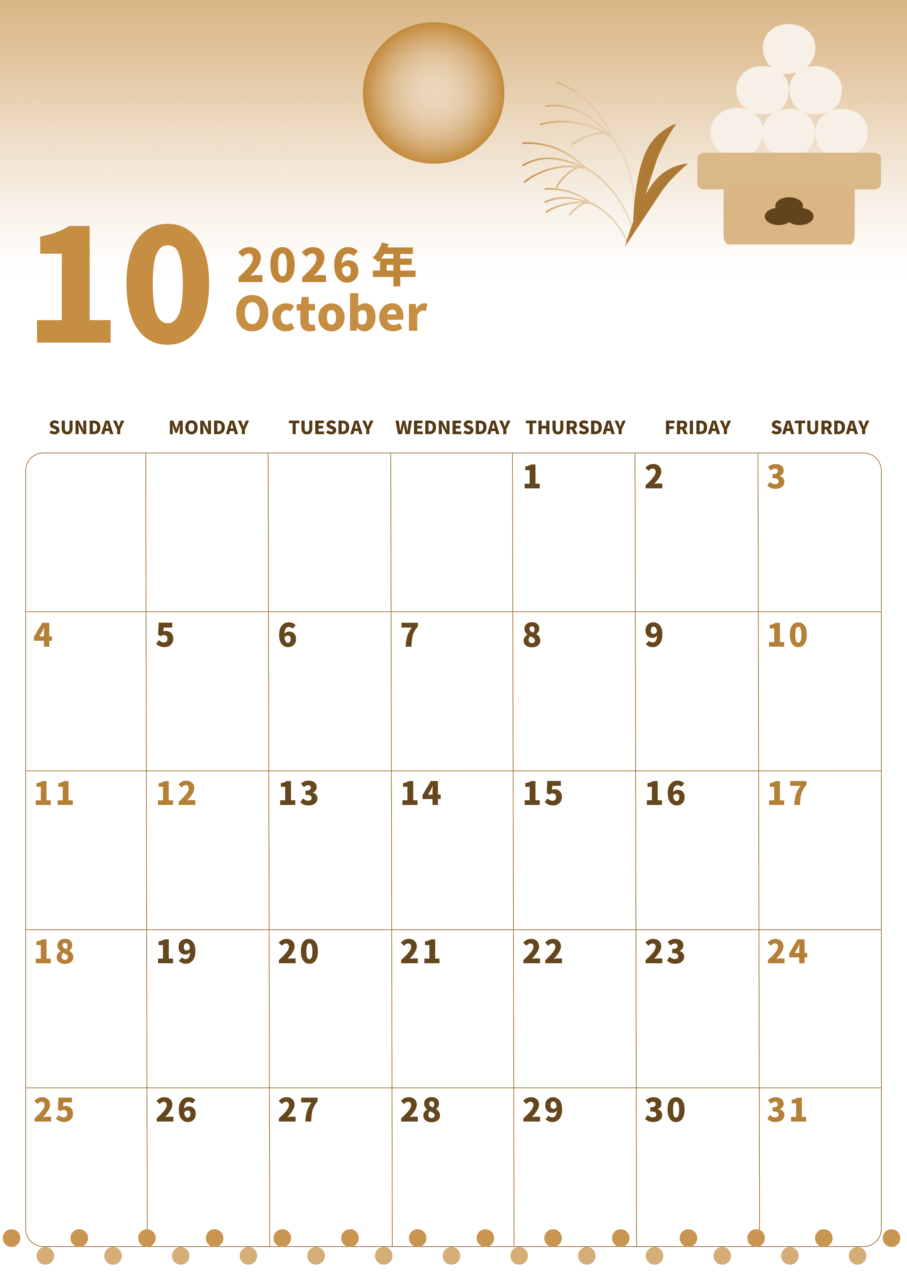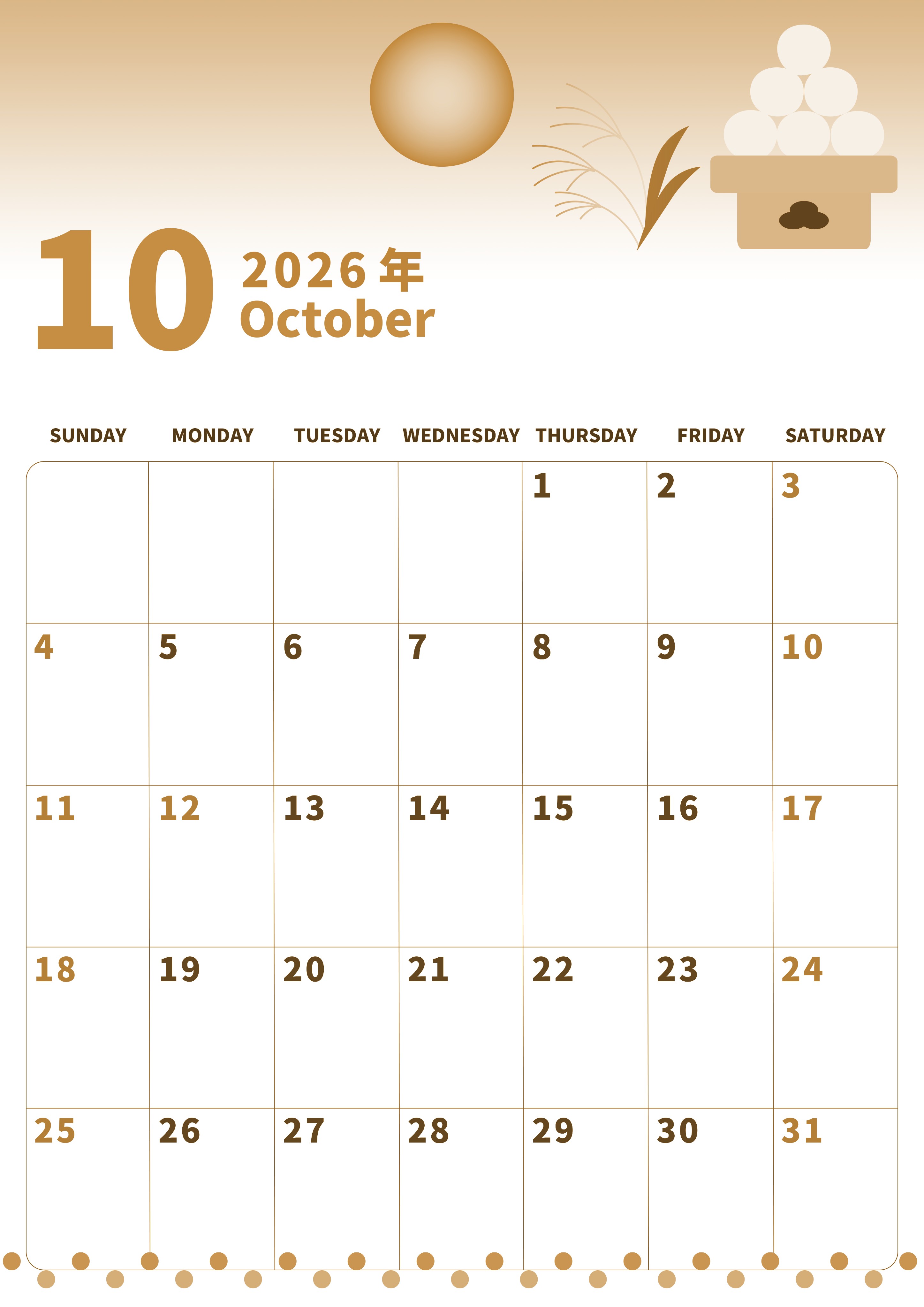2026年10月縦型レトロな日曜始まりの無料テンプレートセピア調カレンダーです。グラデーションを背景に満月をはじめとするお月見にまつわるイラストが描かれているデザインです。月見団子を食べたくなります。(2026-00541010)