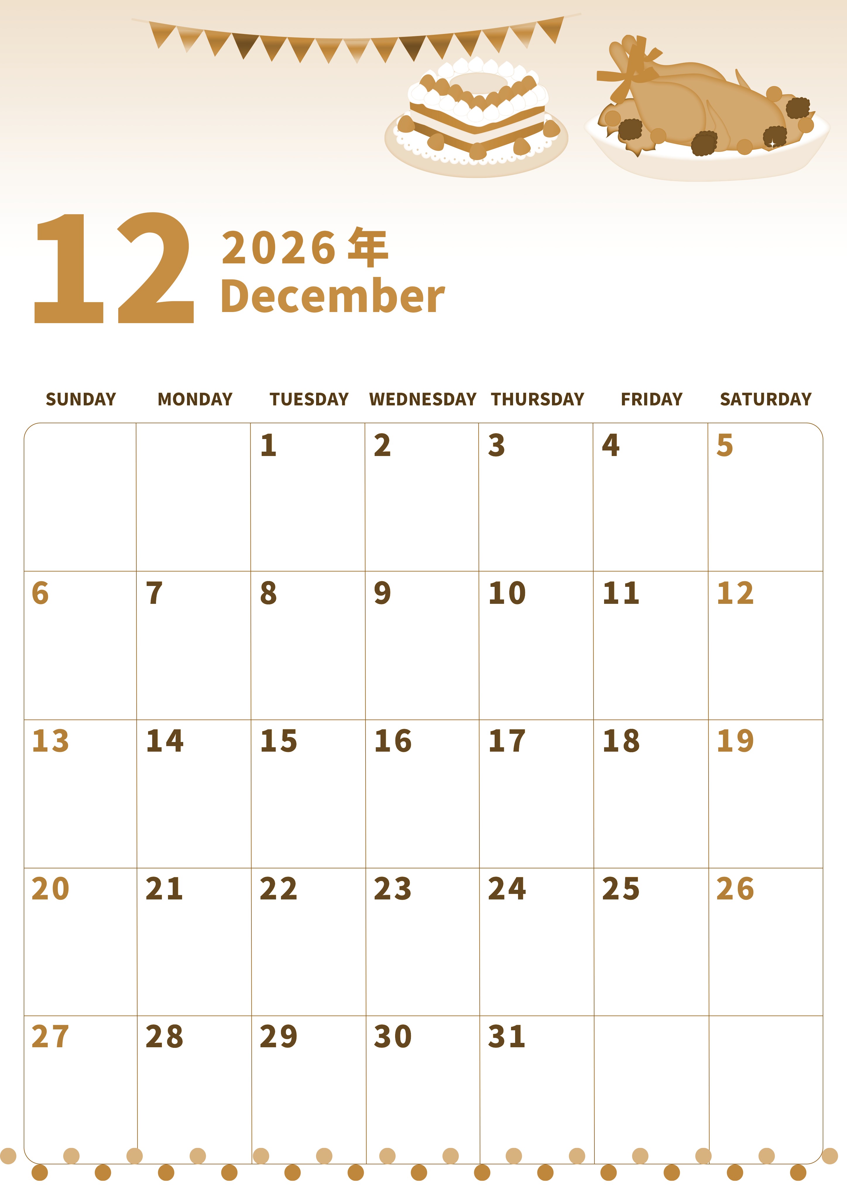 2026年12月縦型レトロな日曜始まりの無料テンプレートセピア調カレンダーです。七面鳥の丸焼きが目を引くクリスマスの高揚感が伝わってくるかわいいイラスト素材です。縦向きなので壁に貼って使うのに向いています。(2026-00541210)