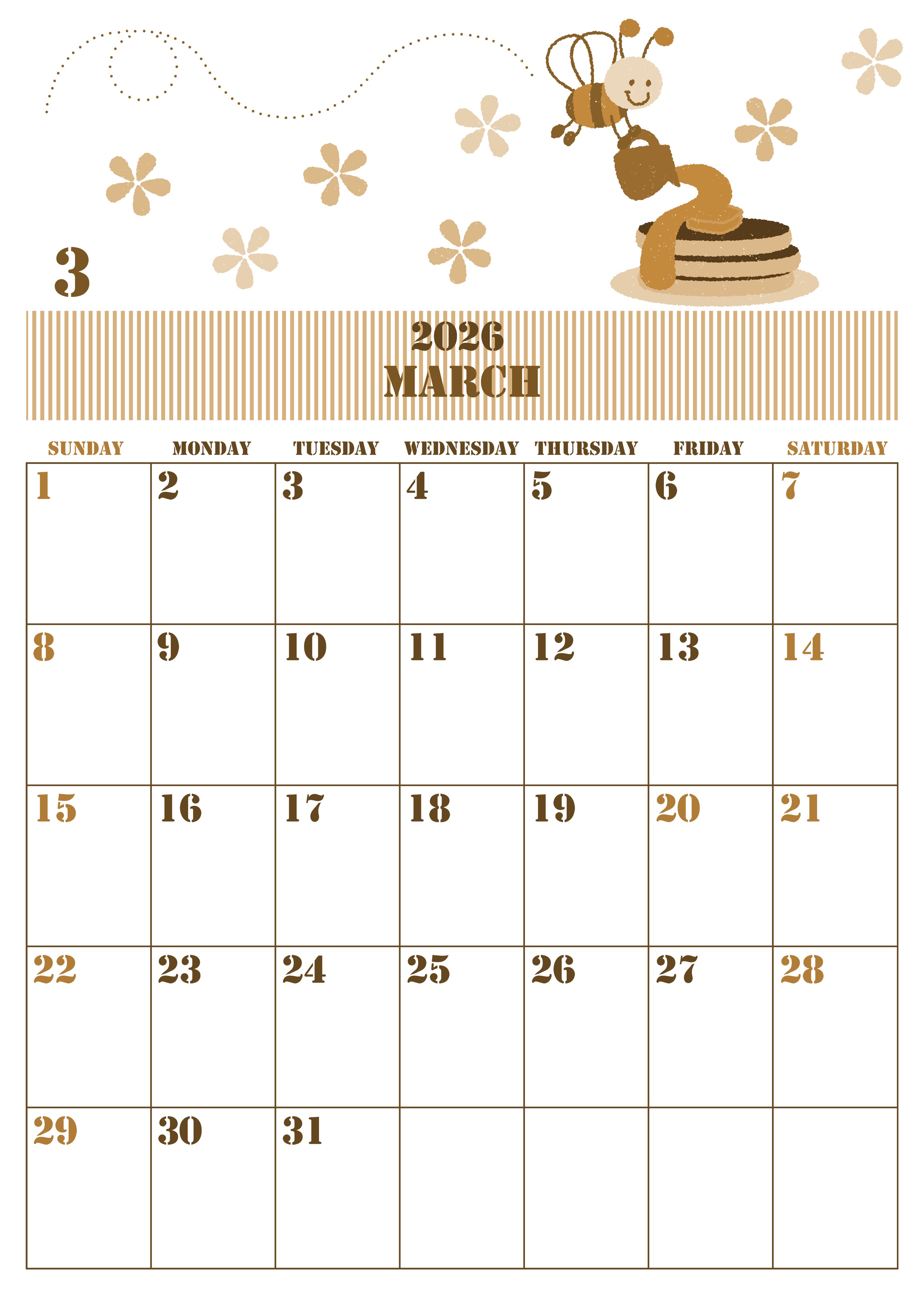 2026年・無料のカレンダーテンプレート 2026年3月縦型レトロな日曜始まり パンケーキイラストのかわいいA4無料セピア調カレンダー(2026-00550310) 素材状デザイン王 2025年4月2日 2026年3月縦型レトロな日曜始まりの無料テンプレートセピア調カレンダーです。ミツバチとパンケーキのコンビネーションがかわいい雰囲気を醸し出しているセピア調カレンダーテンプレートです。(2026-00550310) 3月 縦型のカレンダー 日曜始まり セピア カレンダーデザイン-0055