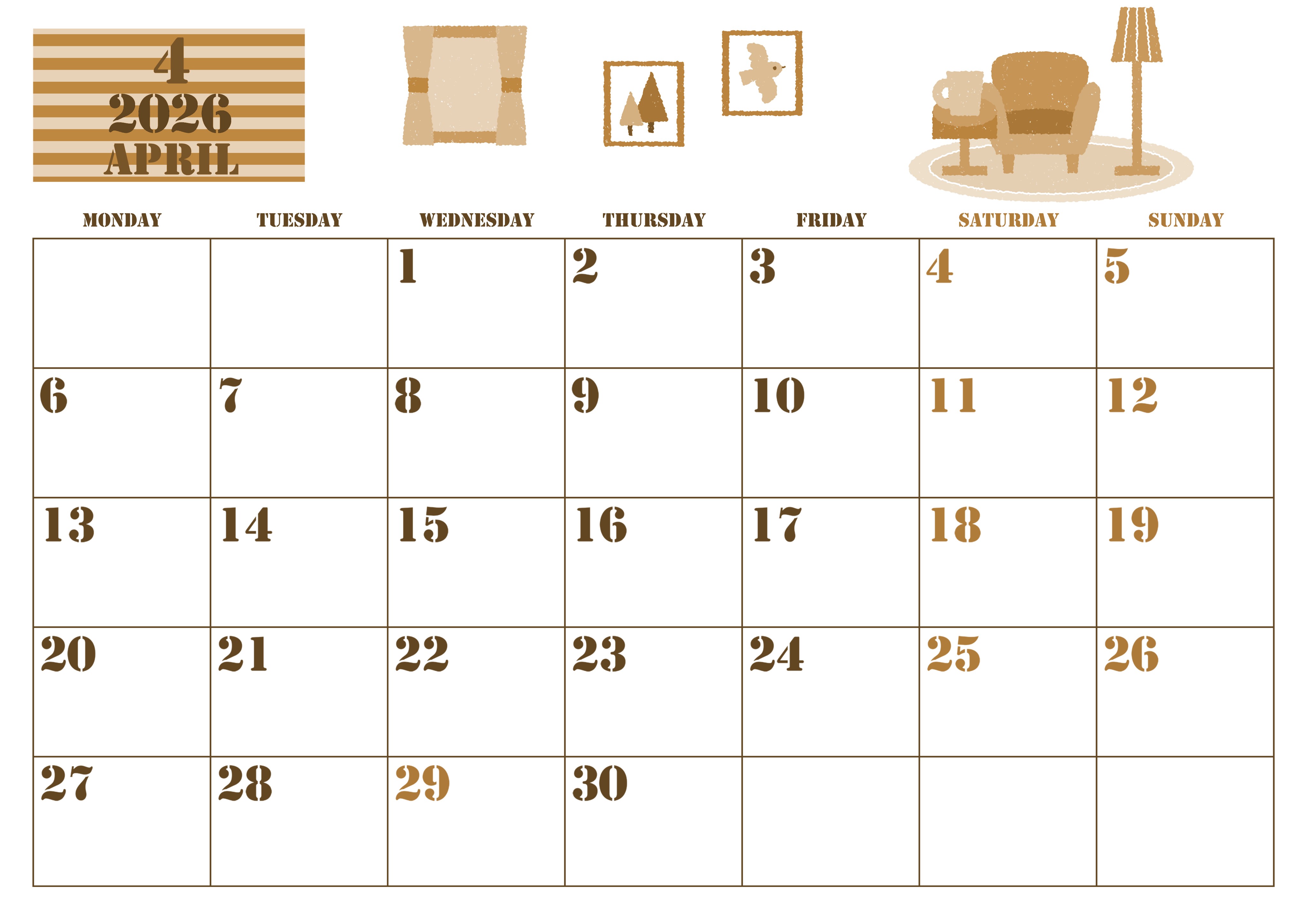 2026年4月横型レトロな月曜始まりの無料テンプレートセピア調カレンダーです。家具がかわいい新生活の不安を吹き飛ばしてくれるようなイラストが目を引くテンプレートセピア調カレンダーとなっています。(2026-00550401)