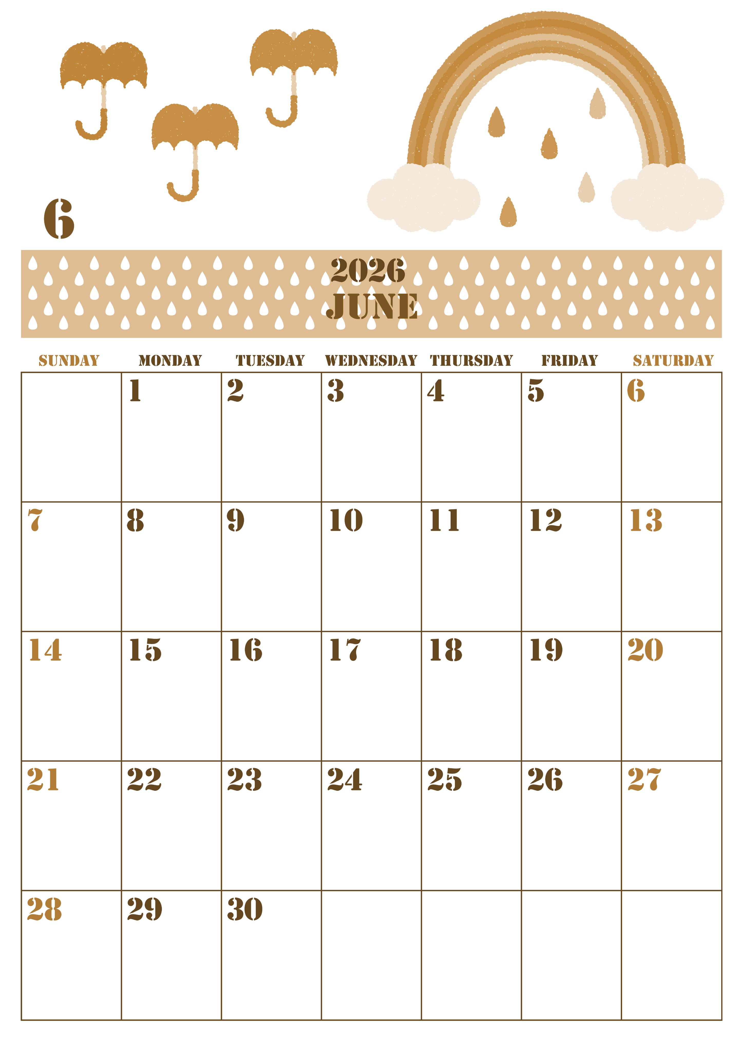 2026年6月縦型レトロな日曜始まりの無料テンプレートセピア調カレンダーです。傘や虹のイラストがほのぼのとした気持ちにさせてくれるかわいいイラストです。白紙に印刷をしてすぐに使えるセピア調カレンダーなので便利です。(2026-00550610)