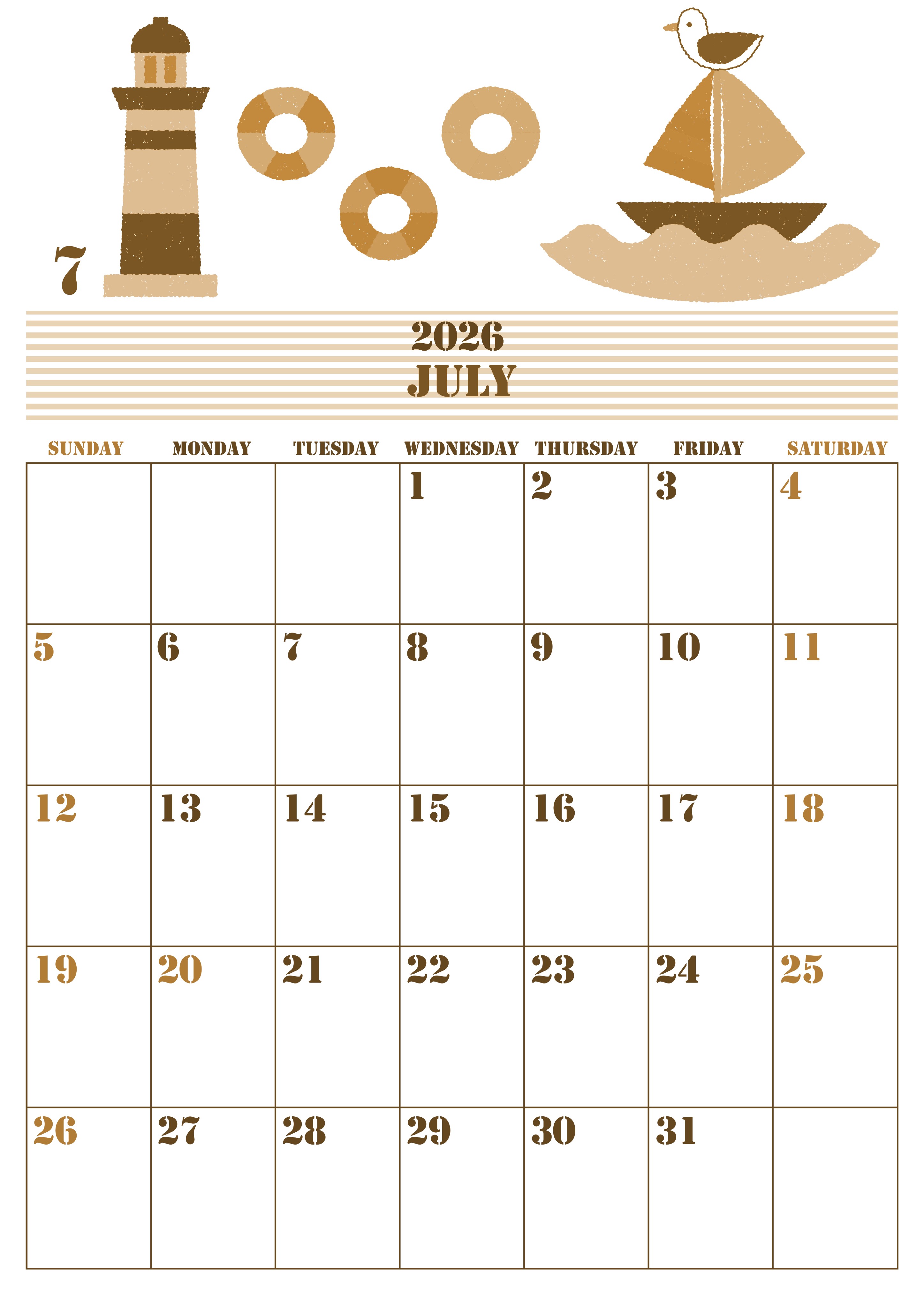 2026年7月縦型レトロな日曜始まりの無料テンプレートセピア調カレンダーです。マリンテイストなセピア調カレンダーがシンプルでありながらもかわいいセピア調カレンダーです。縦型なので印刷をして壁に貼って使うのに適しているサイズ感です。(2026-00550710)