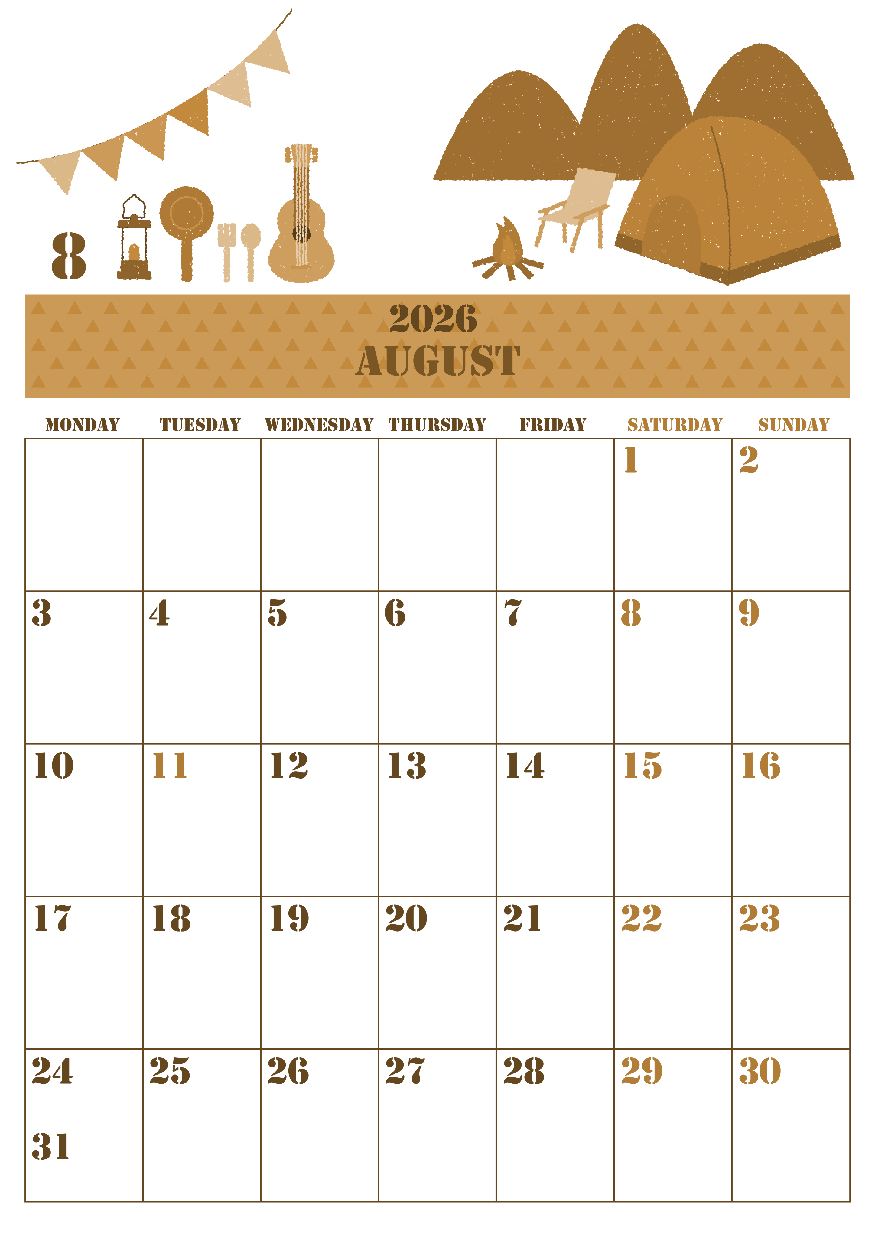 2026年8月縦型レトロな月曜始まりの無料テンプレートセピア調カレンダーです。夏休みにキャンプで楽しんでいるシーンを取り上げたかわいいポップで鮮やかな月曜始まりのイラストセピア調カレンダーとなっています。(2026-00550811)