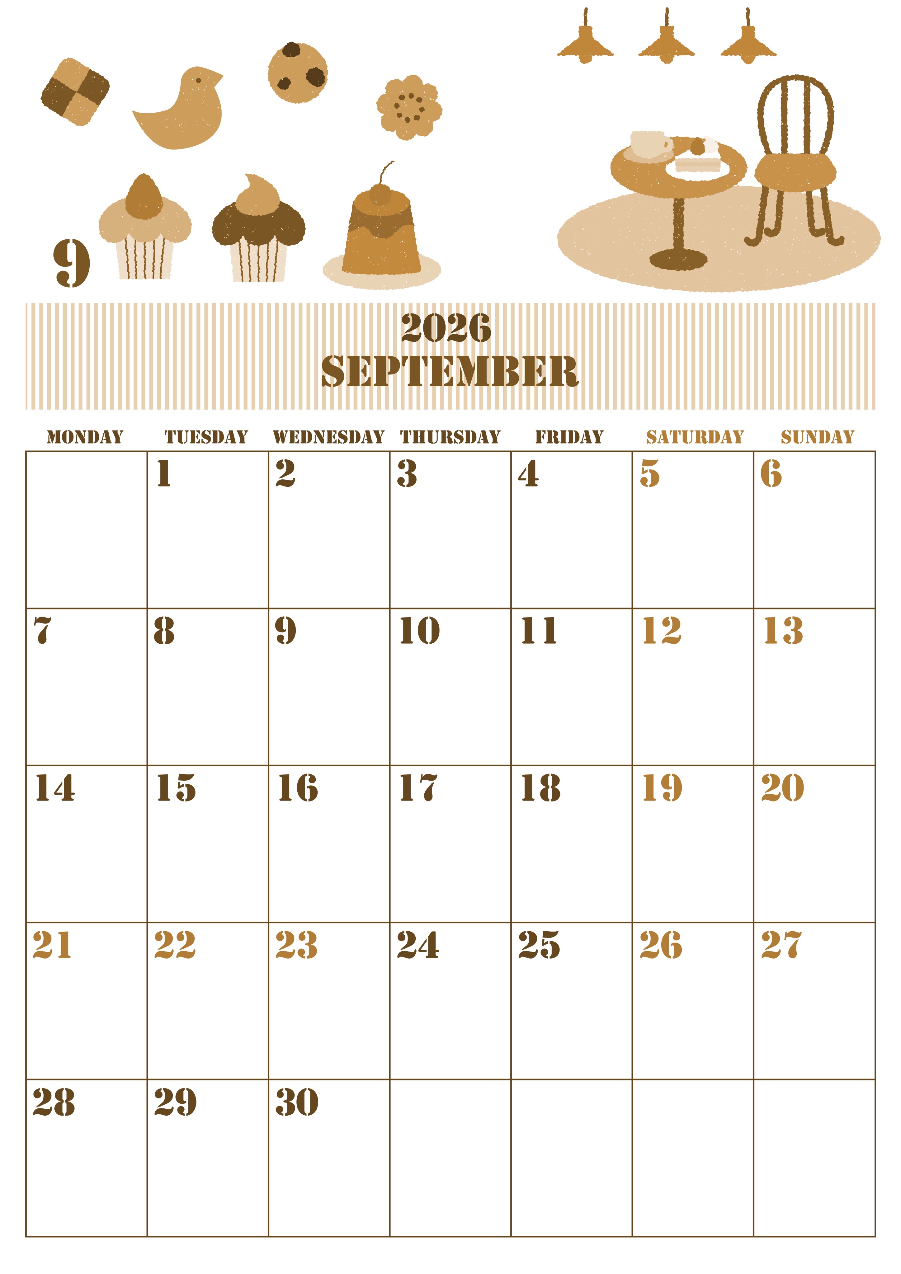 2026年9月縦型レトロな月曜始まりの無料テンプレートセピア調カレンダーです。食欲の秋に食べたくなるいろいろな種類のカップケーキのイラストがとてもかわいい女心をくすぐるような魅力的な月曜始まりセピア調カレンダーです。(2026-00550911)