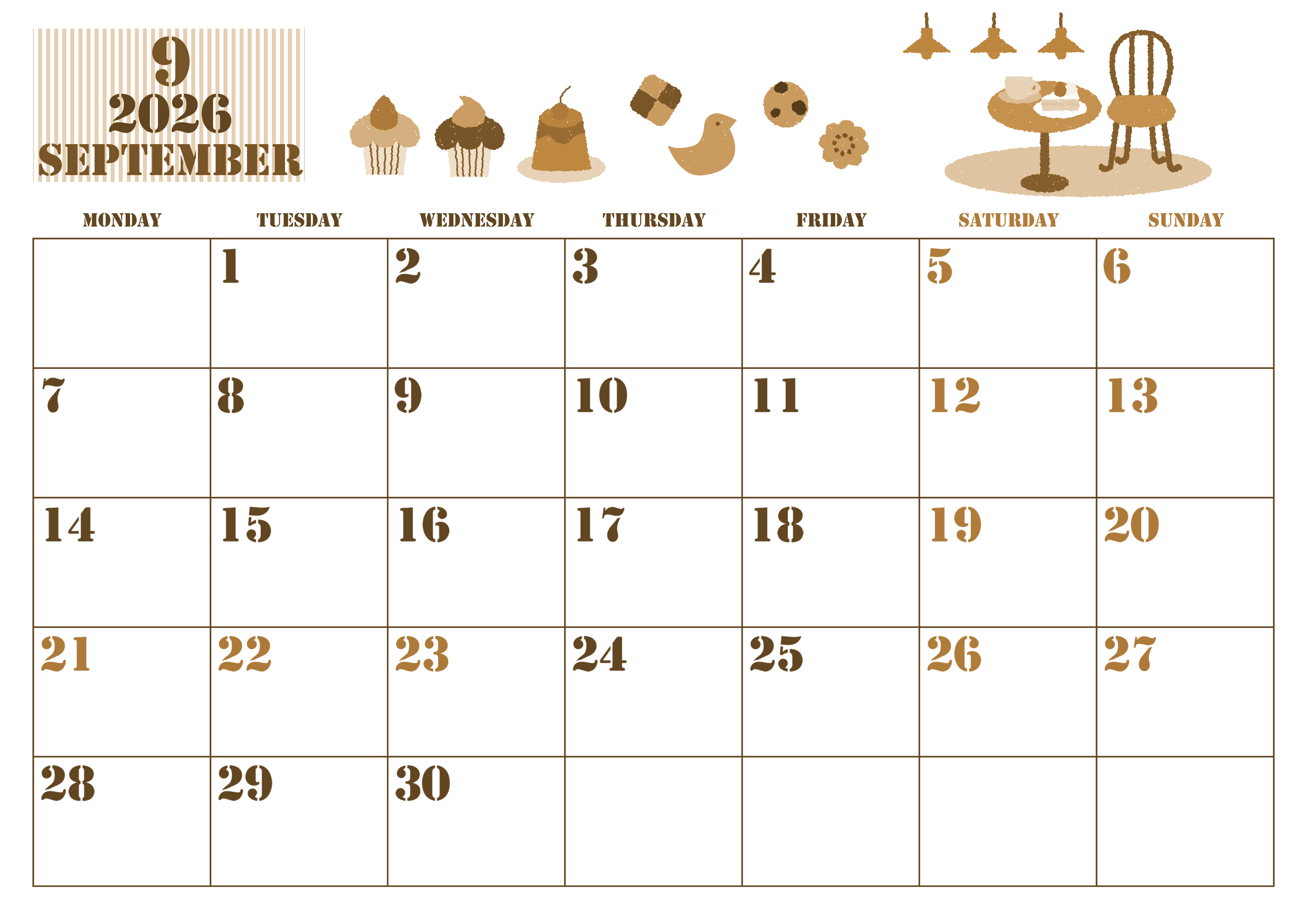 2026年9月横型レトロな月曜始まりの無料テンプレートセピア調カレンダーです。月曜始まりのレイアウトがセピア調カレンダーは使いやすいと思っている人に無料でダウンロードをしてほしいフリー素材です。イラストは食欲の秋をテーマにしていてかわいいです。(2026-00550901)
