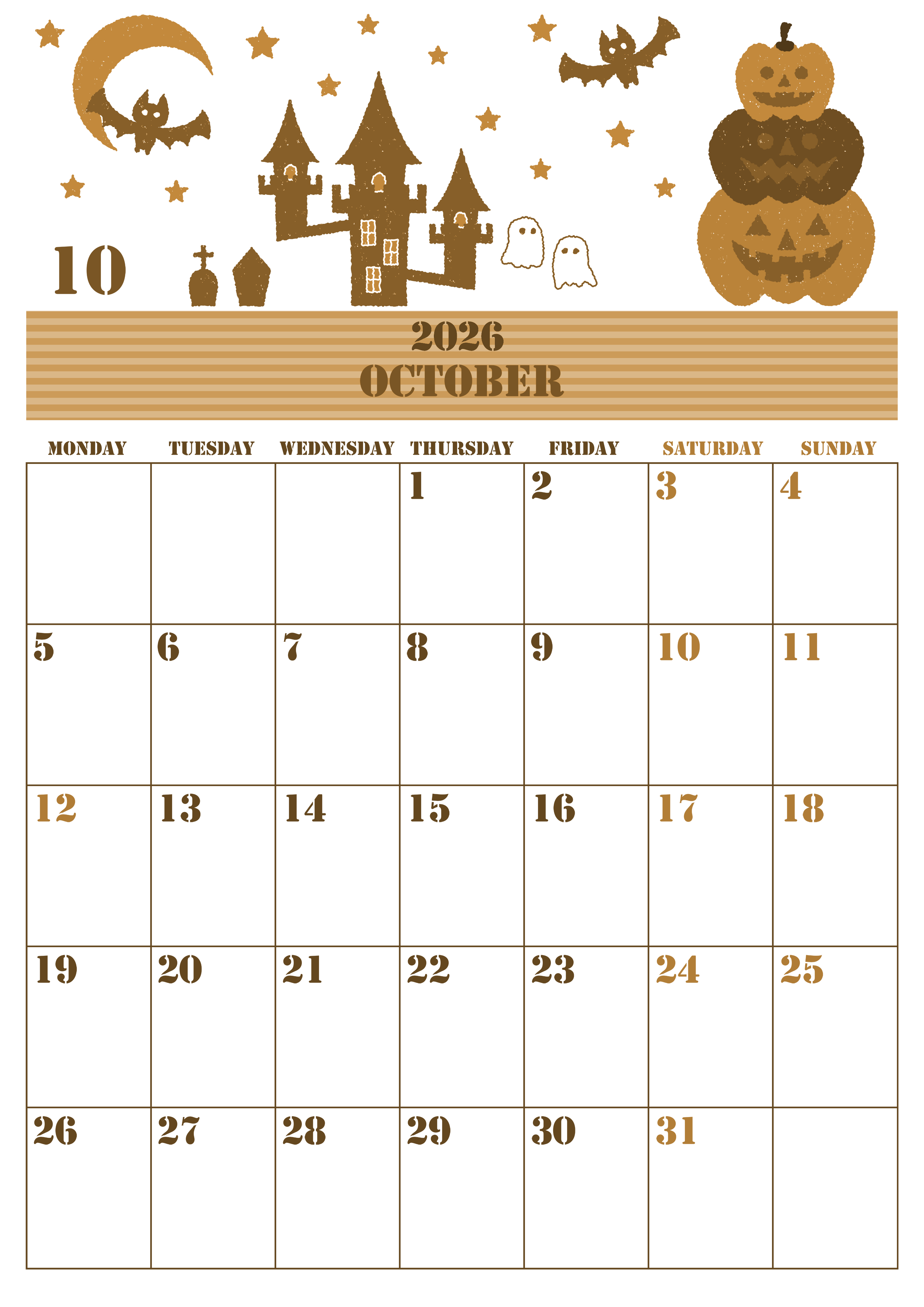 2026年・無料のカレンダーテンプレート 2026年10月縦型レトロな月曜始まり ハロウィンイラストがかわいいA4無料セピア調カレンダー(2026-00551011) 素材状デザイン王 2025年4月2日 2026年10月縦型レトロな月曜始まりの無料テンプレートセピア調カレンダーです。月と星がちりばめている空を背景に白いおばけやコウモリがあちこちにいるハロウィンのイラストがポップでかわいいです。(2026-00551011) 10月 縦型のカレンダー 月曜始まり セピア カレンダーデザイン-0055