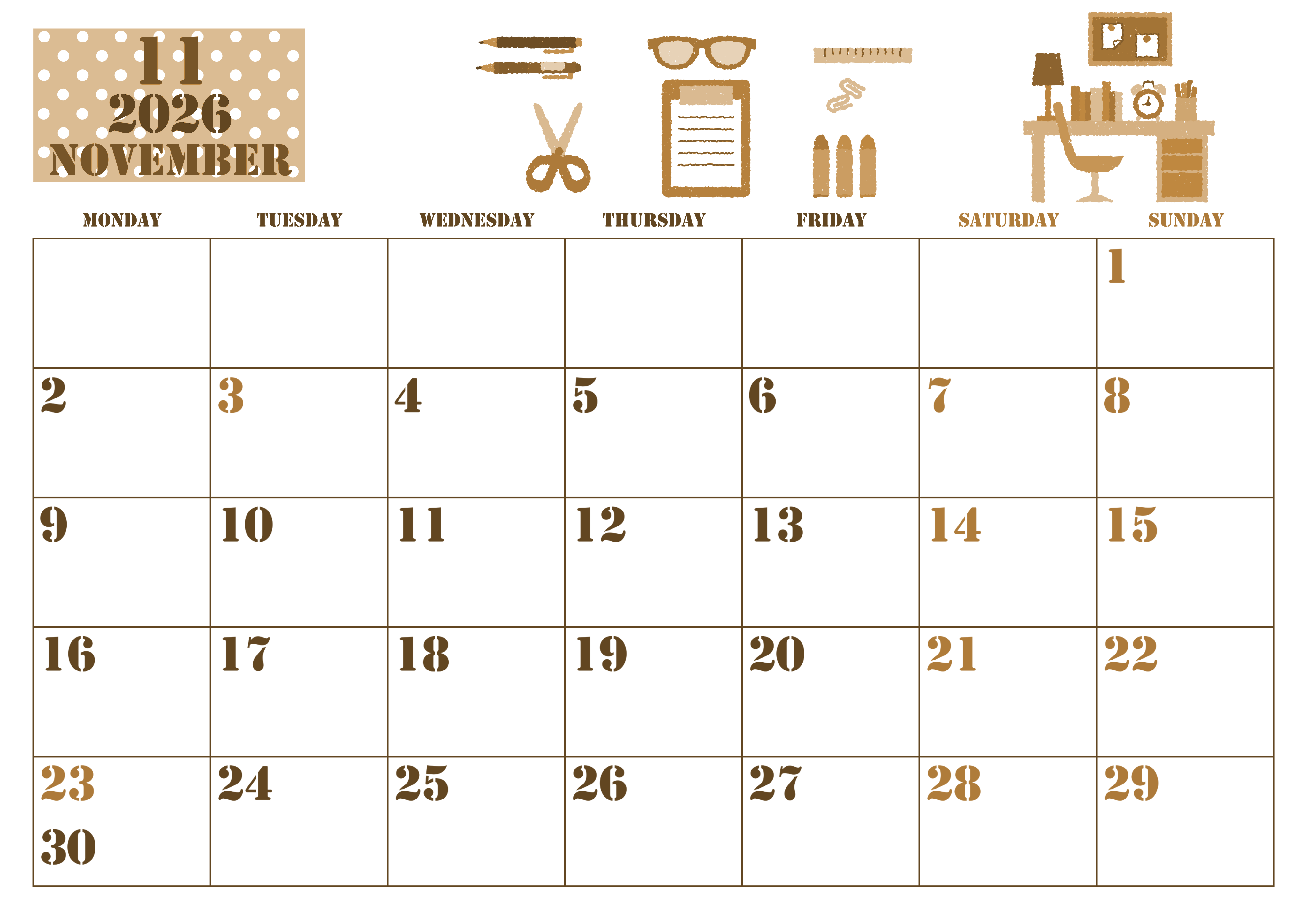 2026年11月横型レトロな月曜始まり 文房具イラストのかわいいA4無料セピア調カレンダー(2026-00551101)