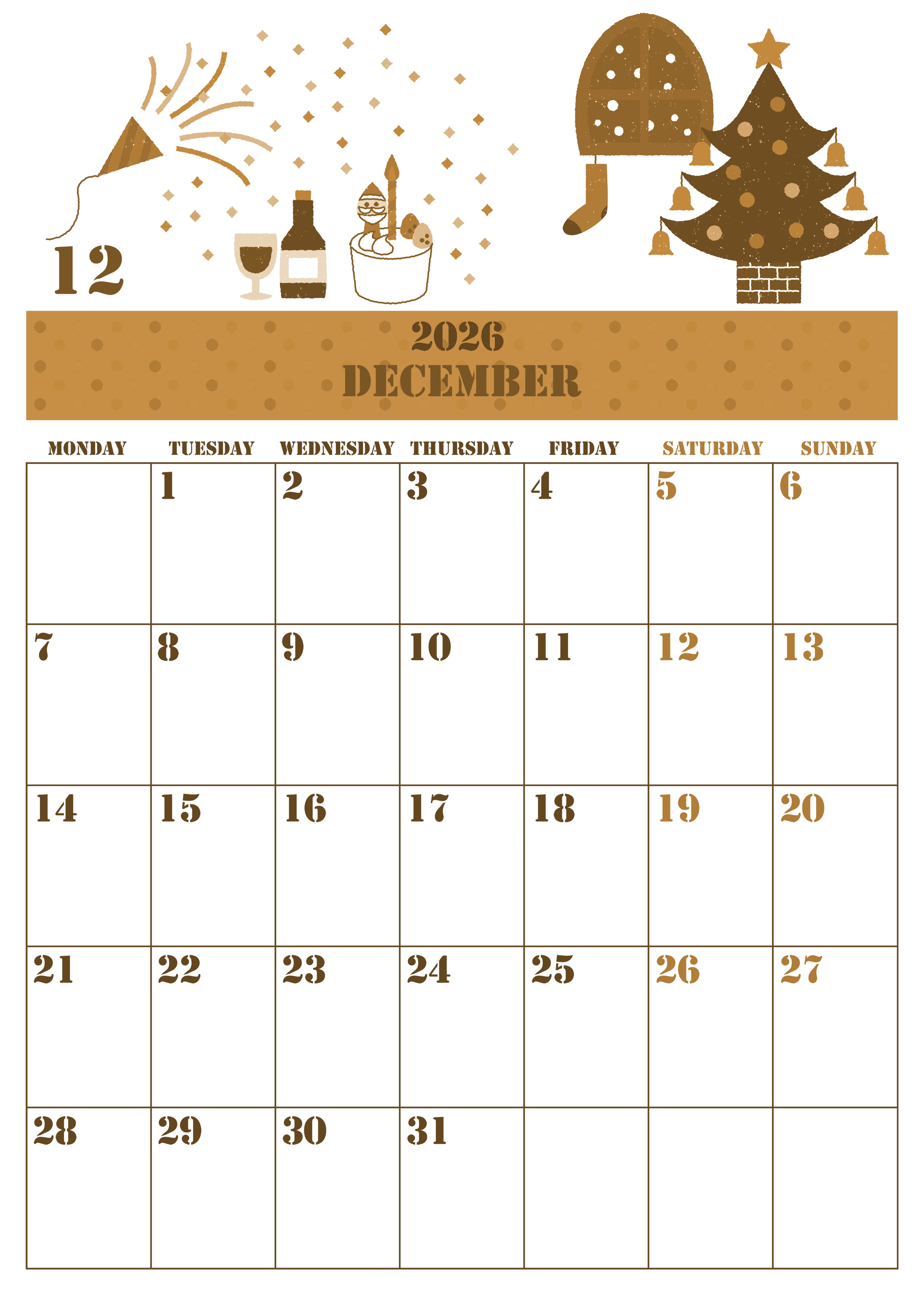 2026年12月縦型レトロな月曜始まりの無料テンプレートセピア調カレンダーです。パーティーの盛り上がりが伝わってくるようなかわいいイラストです。月曜始まりで文字の色分けがされているので見やすい利便性の高いセピア調カレンダーとなっています。(2026-00551211)