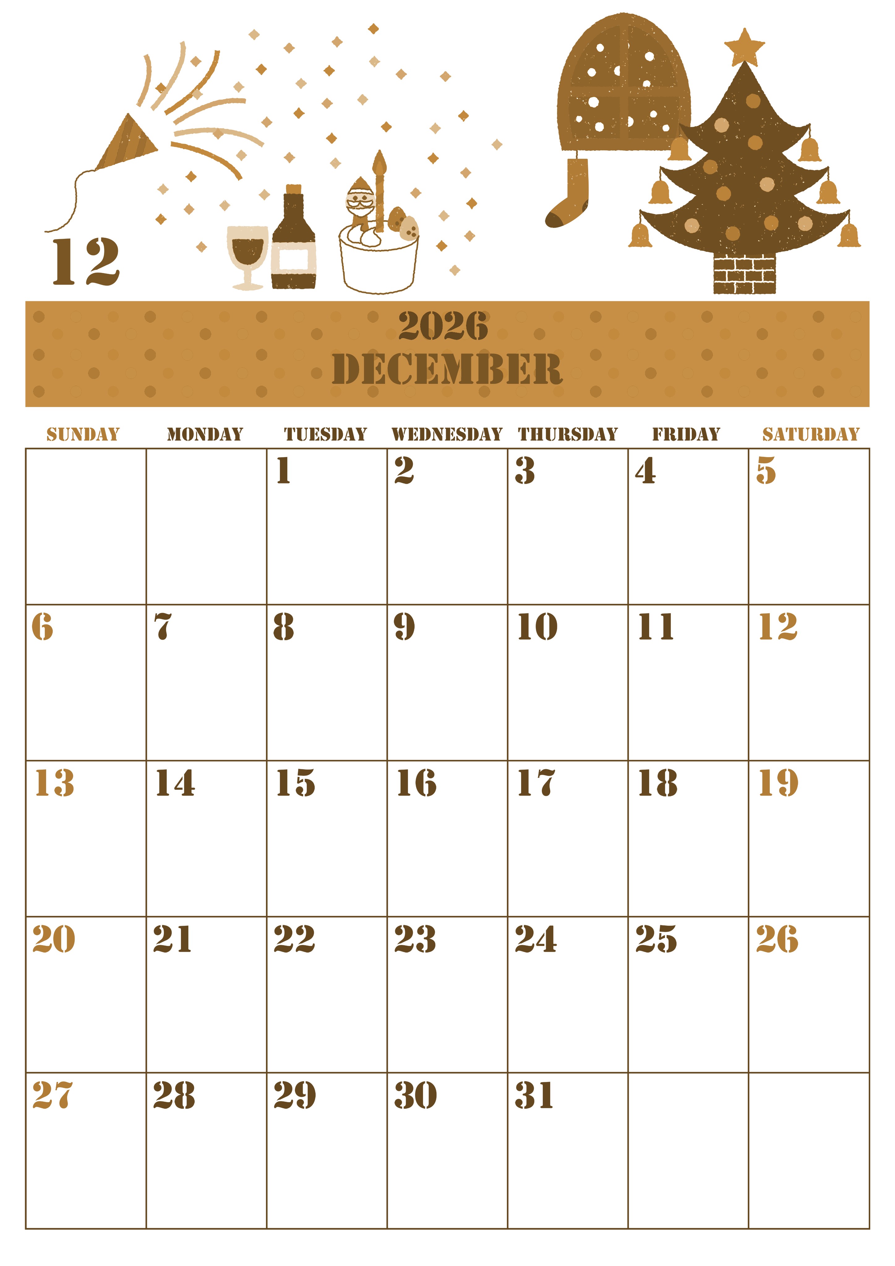 2026年12月縦型レトロな日曜始まりの無料テンプレートセピア調カレンダーです。クリスマスツリーや靴下やクラッカーやワインといったパーティー要素がたっぷり詰まっているかわいいイラストとなっています。(2026-00551210)