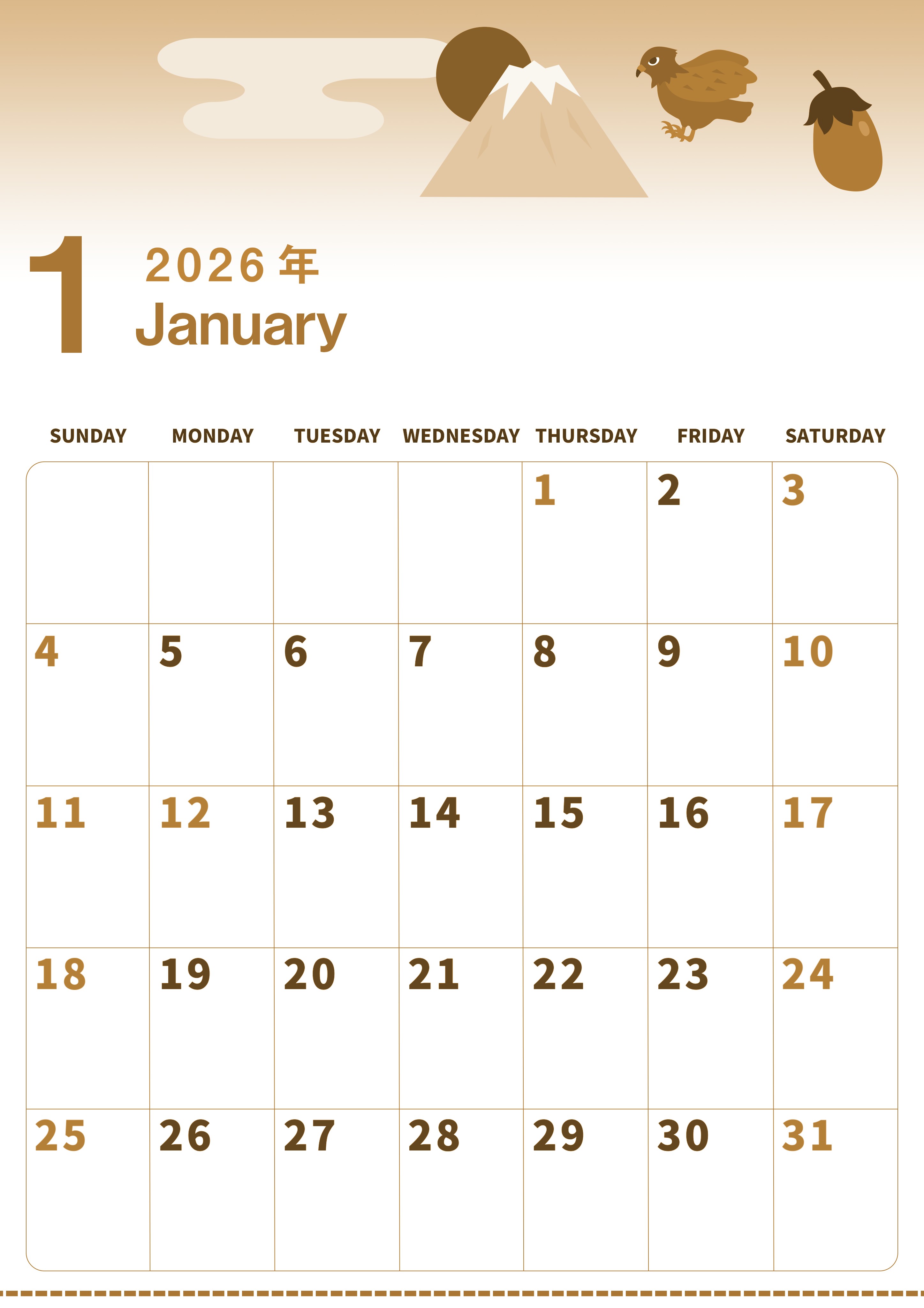 2026年1月縦型レトロな日曜始まりセピア調カレンダーです。イラストの背景は半分以上は白色なので印刷をする時にあまりインクを使わないので経済的です。お正月のイメージを前面に押したイラストが目を引くセピア調カレンダーのフリー素材です。(2026-00560110)