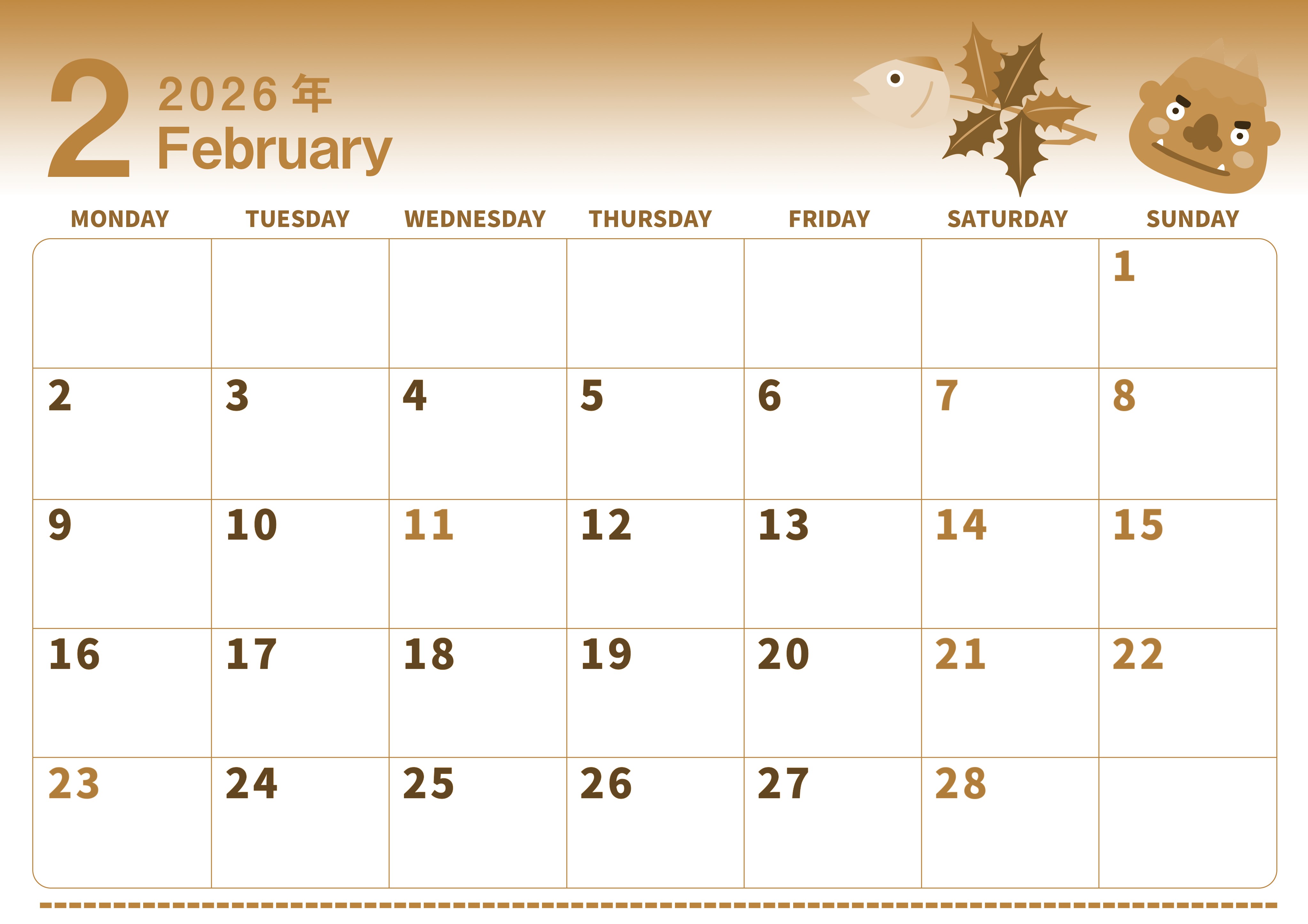 2026年2月横型レトロな月曜始まりの無料テンプレートセピア調カレンダーです。目に優しいイラストのセピア調カレンダーです。秋刀魚と鬼のタッグのイラストがかわいいです。月曜始まりなので使いやすいです。(2026-00560201)