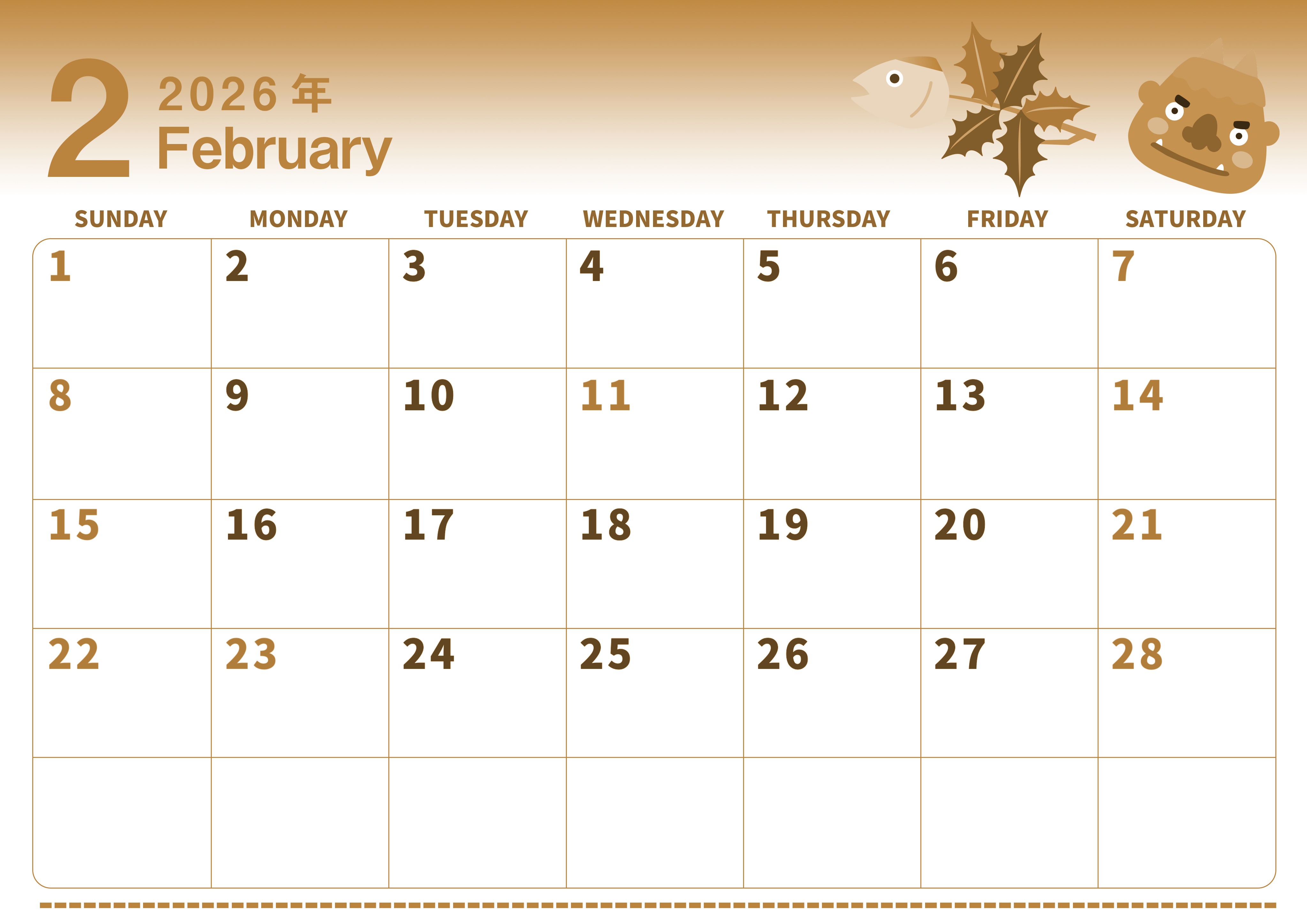 2026年2月横型レトロな日曜始まりの無料テンプレートセピア調カレンダーです。鬼のイラストが自信満々そうでかわいいセピア調カレンダーです。横型でA4印刷用なのでお気軽に無料ダウンロードを行ってスケジュール管理に有効活用して頂けます。(2026-00560200)