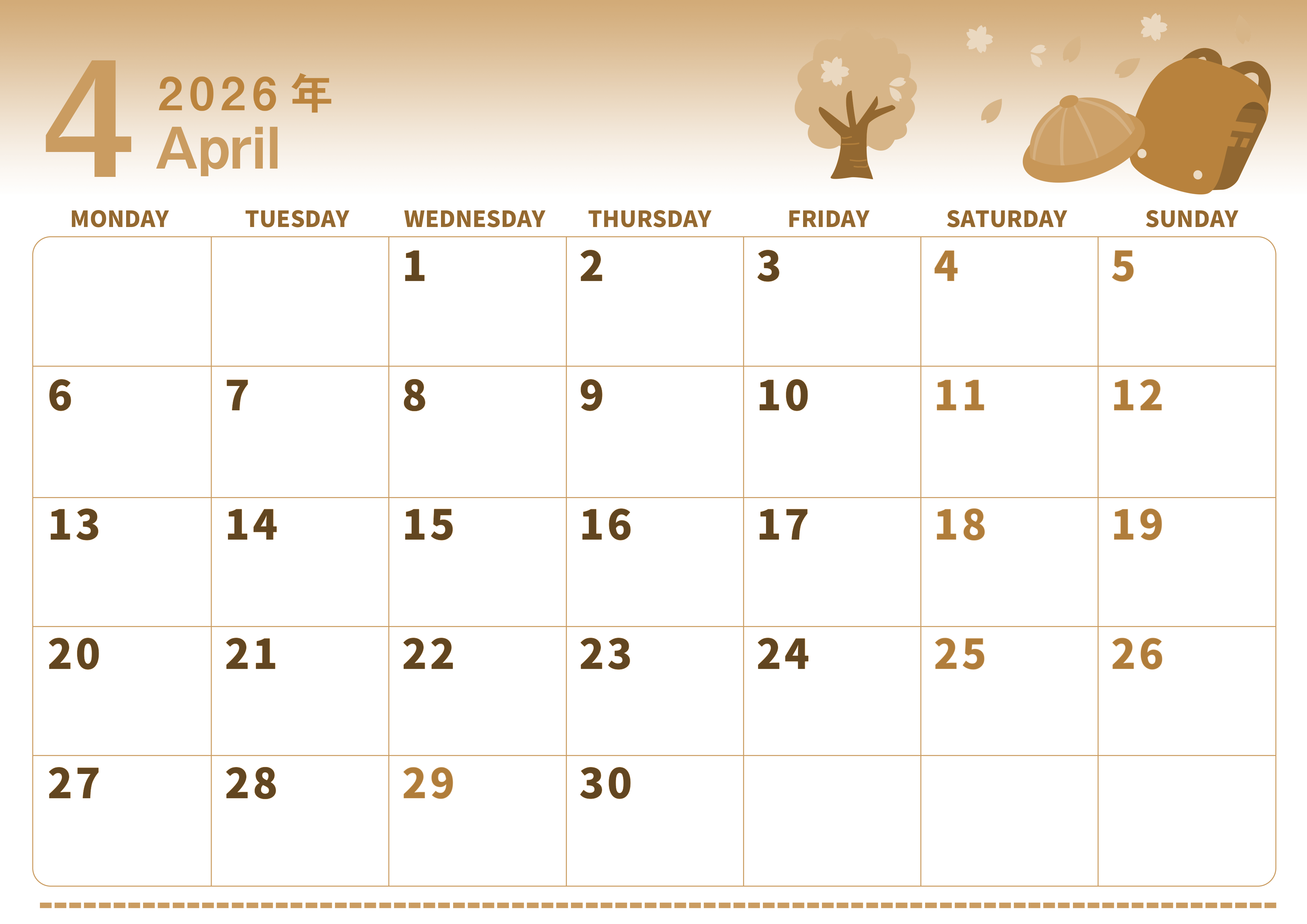 2026年4月横型レトロな月曜始まりの無料テンプレートセピア調カレンダーです。ランドセルと帽子が小学生の新学期を彷彿とさせるかわいいイラストがついているセピア調カレンダーです。月曜始まりなので勉強の計画を立てるのにぴったり。(2026-00560401)