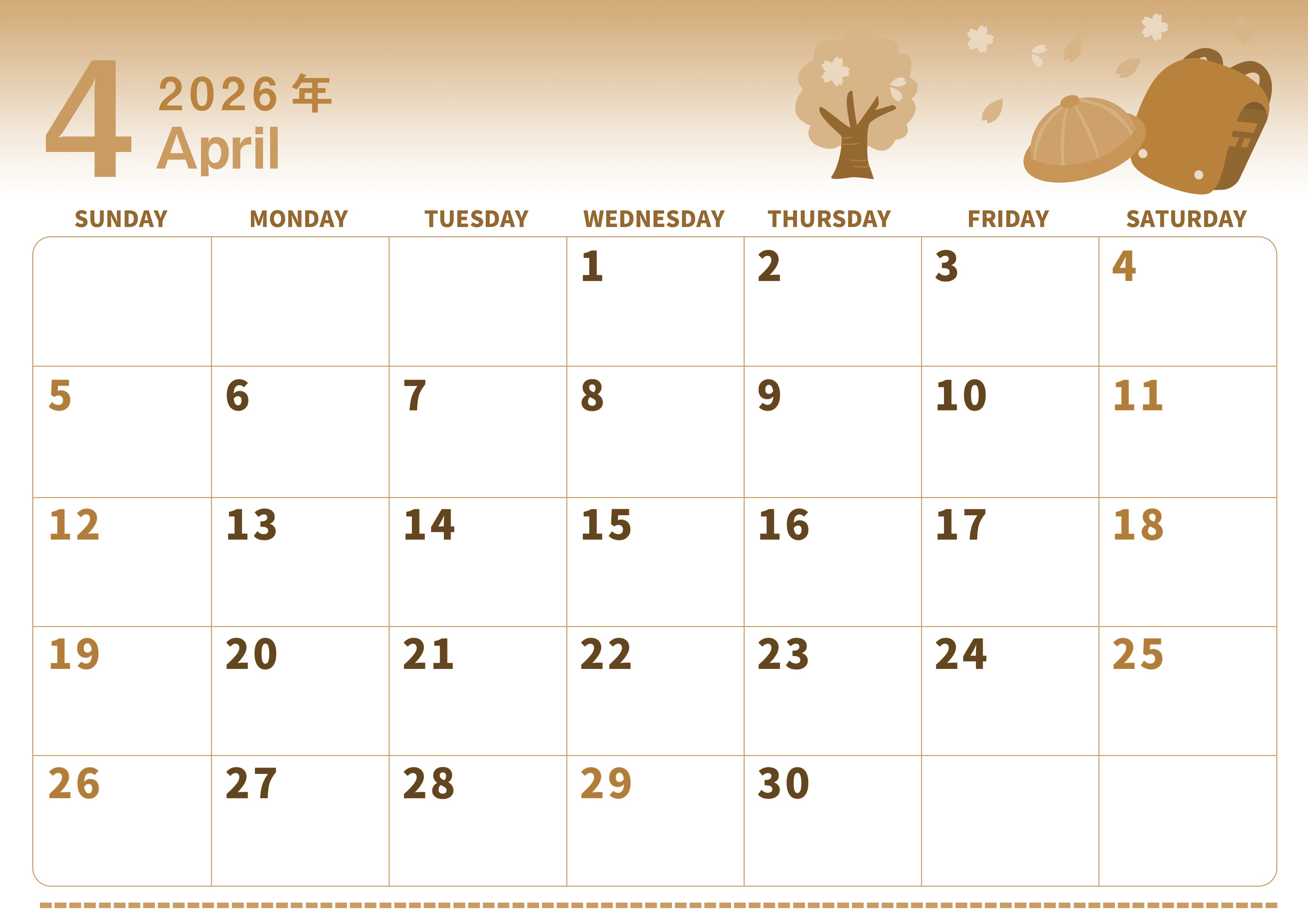 2026年4月横型レトロな日曜始まりの無料テンプレートセピア調カレンダーです。桜の木とランドセルのイラストが新学期の期待感を連想させるようなかわいいテイストの無料ダウンロードが行える便利なセピア調カレンダー素材です。(2026-00560400)