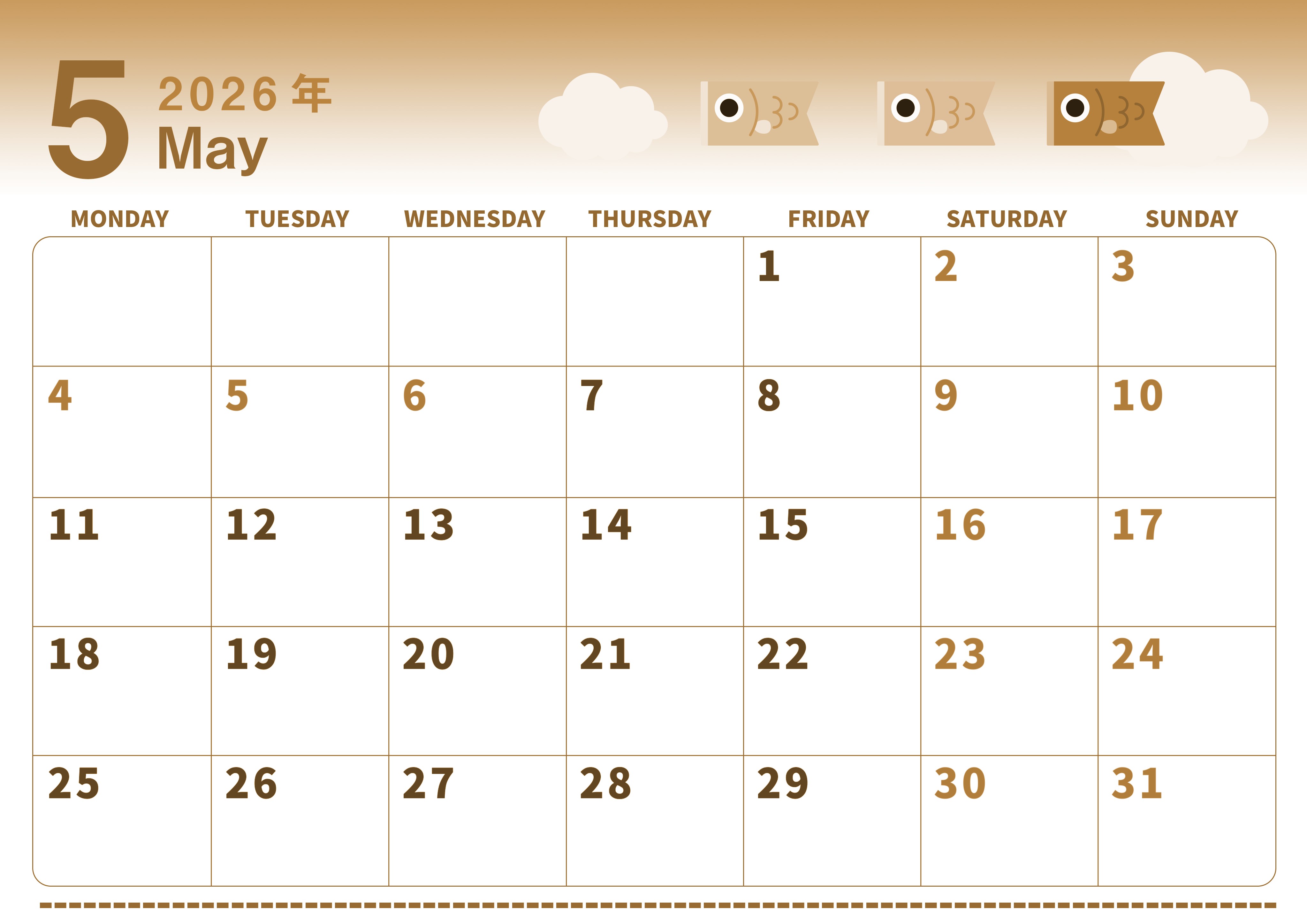 2026年5月横型レトロな月曜始まりの無料テンプレートセピア調カレンダーです。3匹の鯉のぼりのイラストがかわいいセピア調カレンダーです。月曜始まりでA4用紙に印刷用の書き込みに適しているフリー素材です。(2026-00560501)