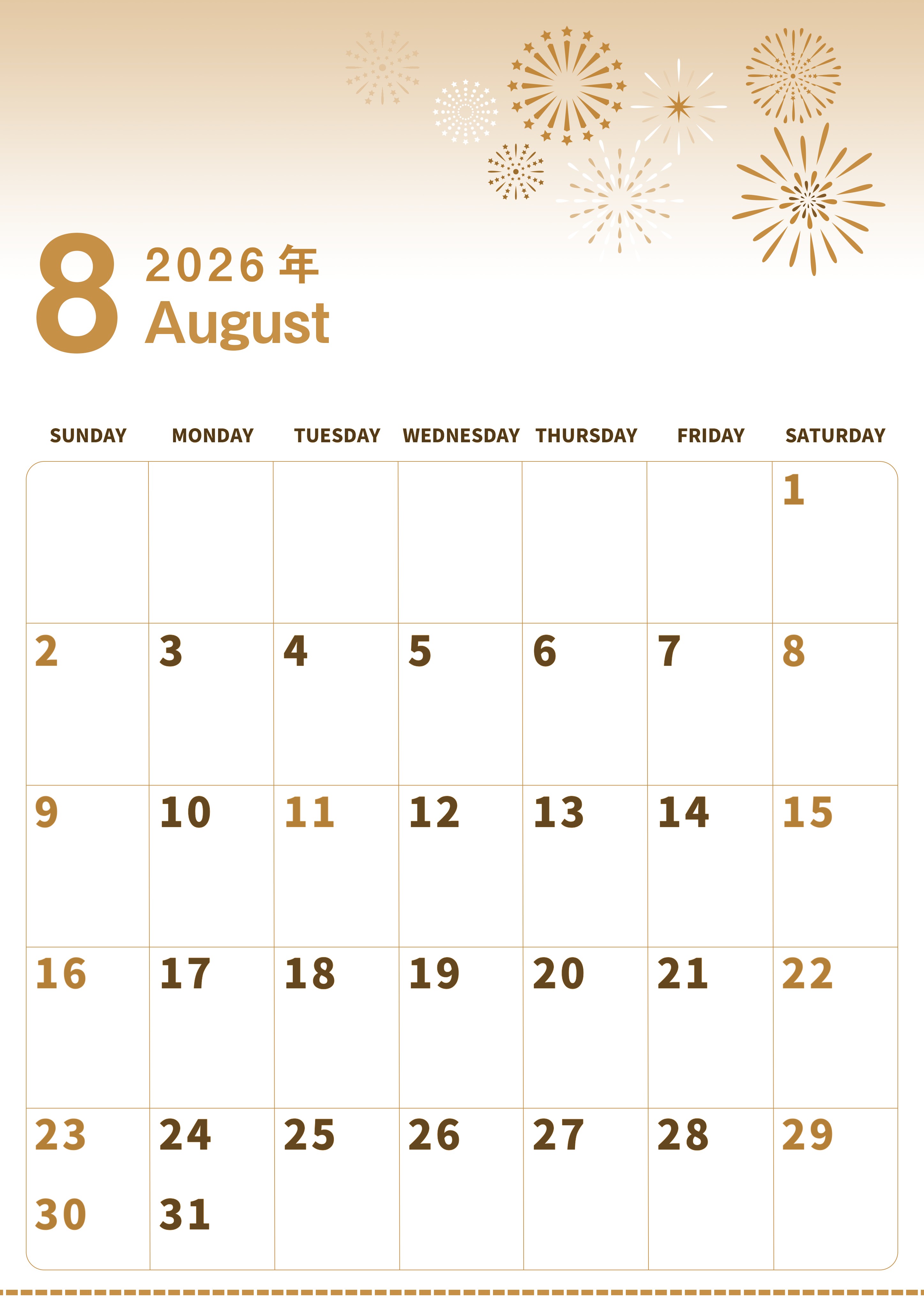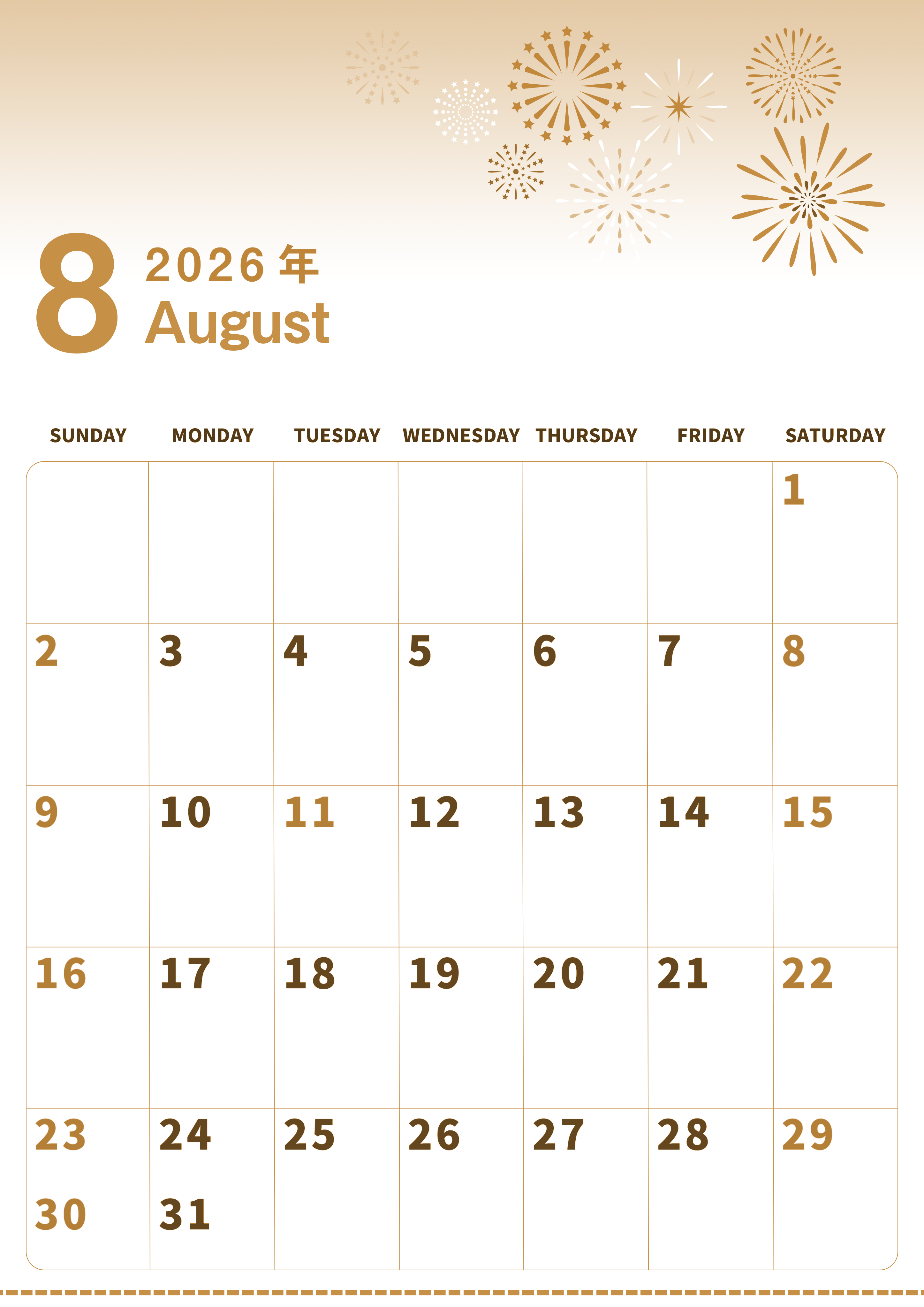 2026年8月縦型レトロな日曜始まりの無料テンプレートセピア調カレンダーです。かわいい打ち上げ花火イラストが目を引くシンプルで使いやすいセピア調カレンダーです。セピア調カレンダーにA4縦型スタイルを求める人におすすめです。(2026-00560810)