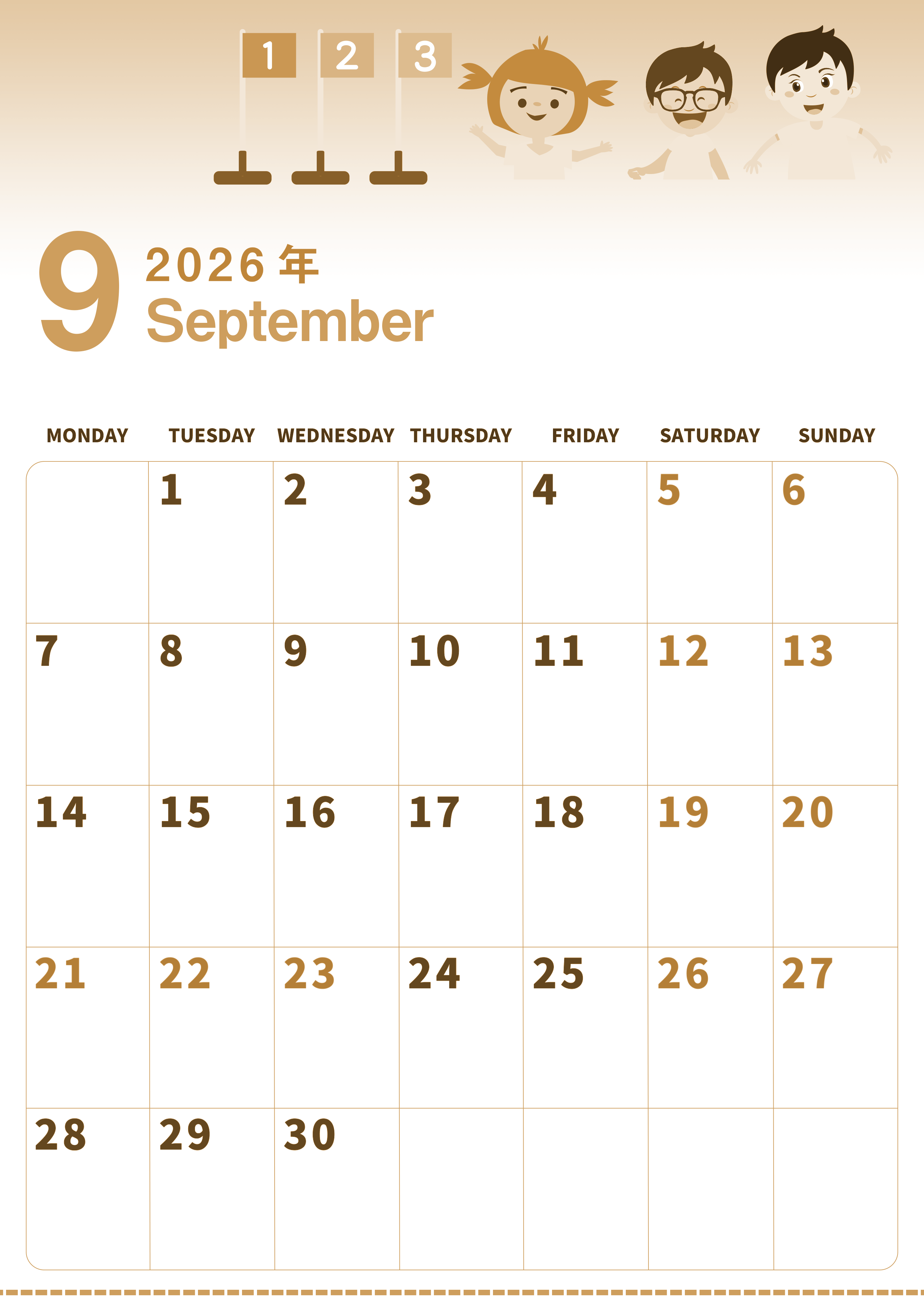 2026年・無料のカレンダーテンプレート 2026年9月縦型レトロな月曜始まり 運動会イラストのかわいいA4無料セピア調カレンダー(2026-00560911) 素材状デザイン王 2025年4月2日 2026年9月縦型レトロな月曜始まりの無料テンプレートセピア調カレンダーです。運動会の様子をグラデーションの背景にシンプルに描いたかわいいイラスト素材となっています。月曜始まりで使いやすいです。(2026-00560911) 9月 縦型のカレンダー 月曜始まり セピア カレンダーデザイン-0056