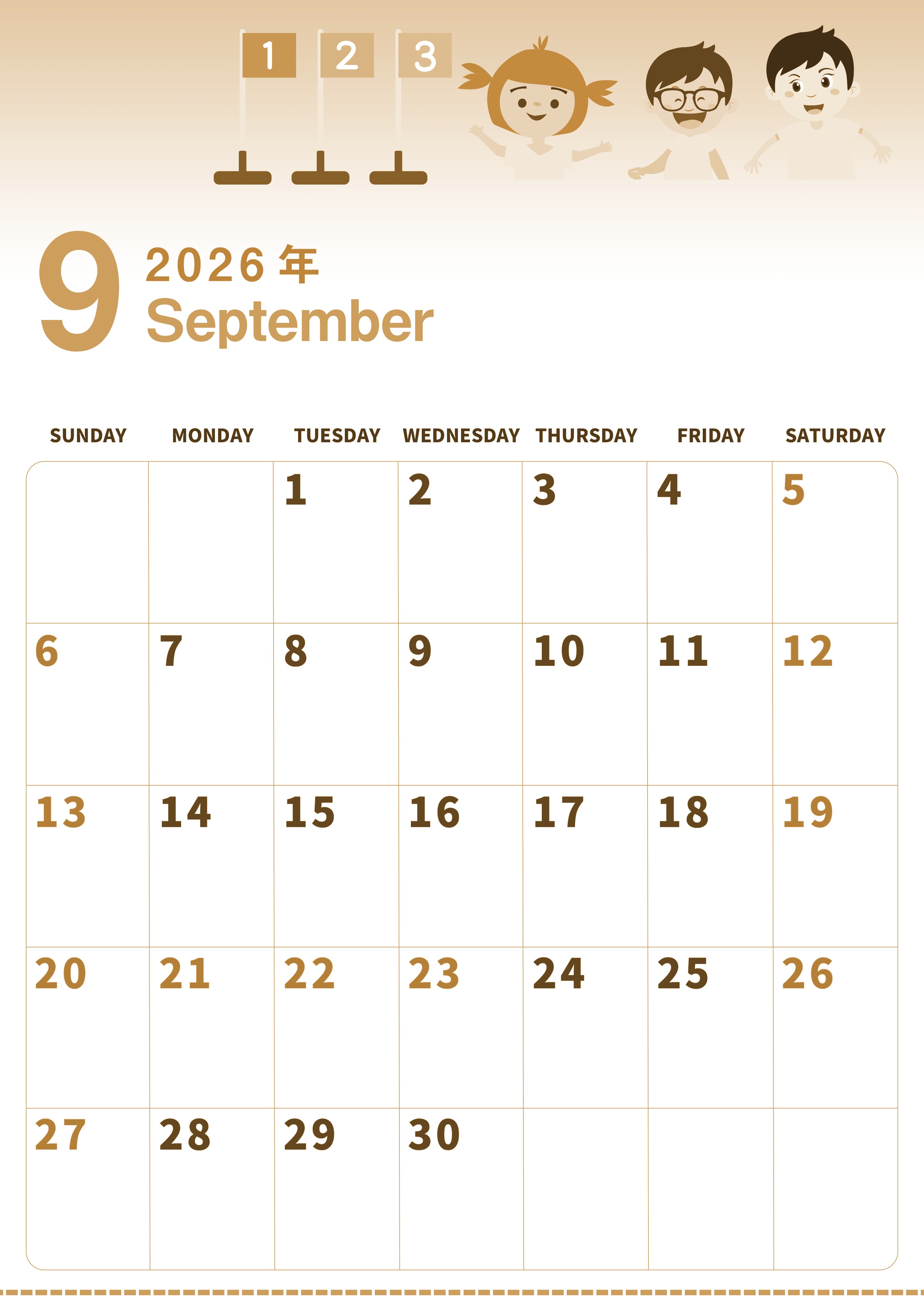 2026年9月縦型レトロな日曜始まりの無料テンプレートセピア調カレンダーです。運動会で楽しそうにしている子供たちを描いたかわいい元気いっぱいのイラストがおすすめポイントとなっています。(2026-00560910)