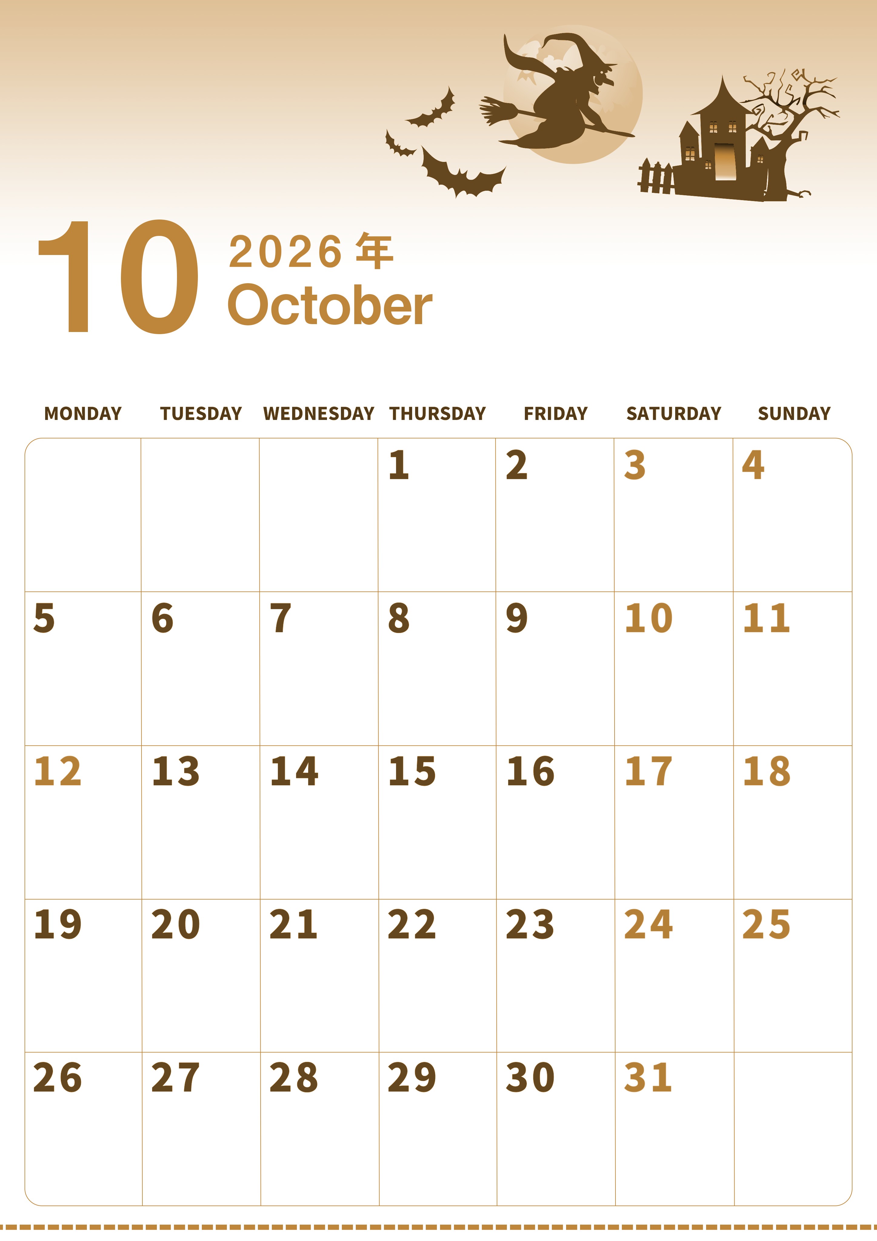 2026年10月縦型レトロな月曜始まりの無料テンプレートセピア調カレンダーです。お城が丁寧に描かれていて全体的にかわいい雰囲気のセピア調カレンダーです。イラスト部分だけでなくスケジュールを書き込める箇所も充実しています。(2026-00561011)