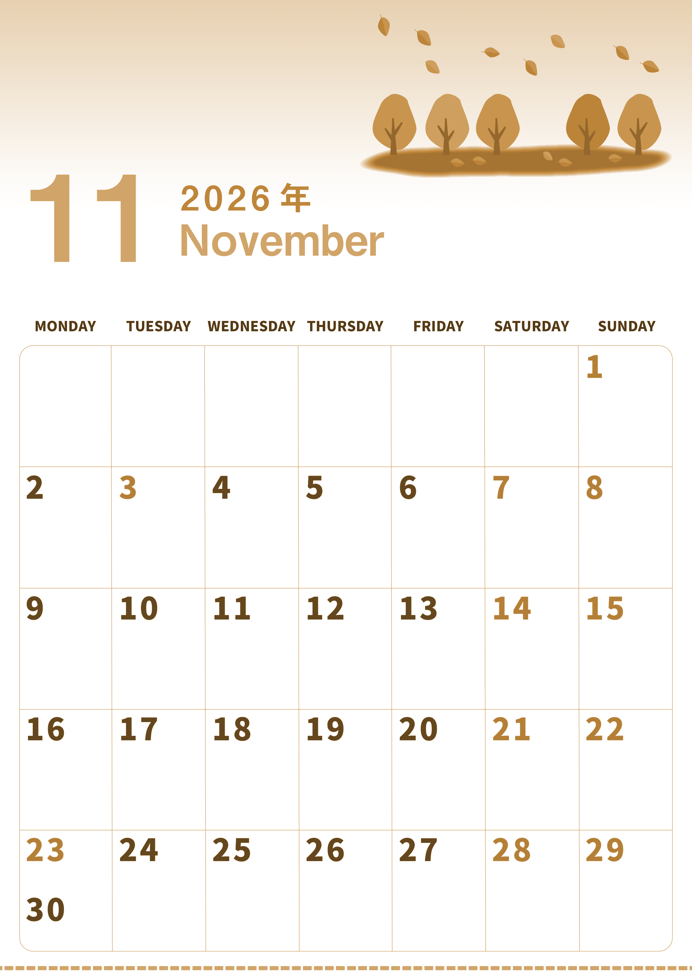 2026年11月縦型レトロな月曜始まりの無料テンプレートセピア調カレンダーです。紅葉を素朴にシンプルに描いているコンテンツです。かわいいイラストだけでなくセピア調カレンダー部分も余白がたっぷりで予定を書き込みやすいです。(2026-00561111)