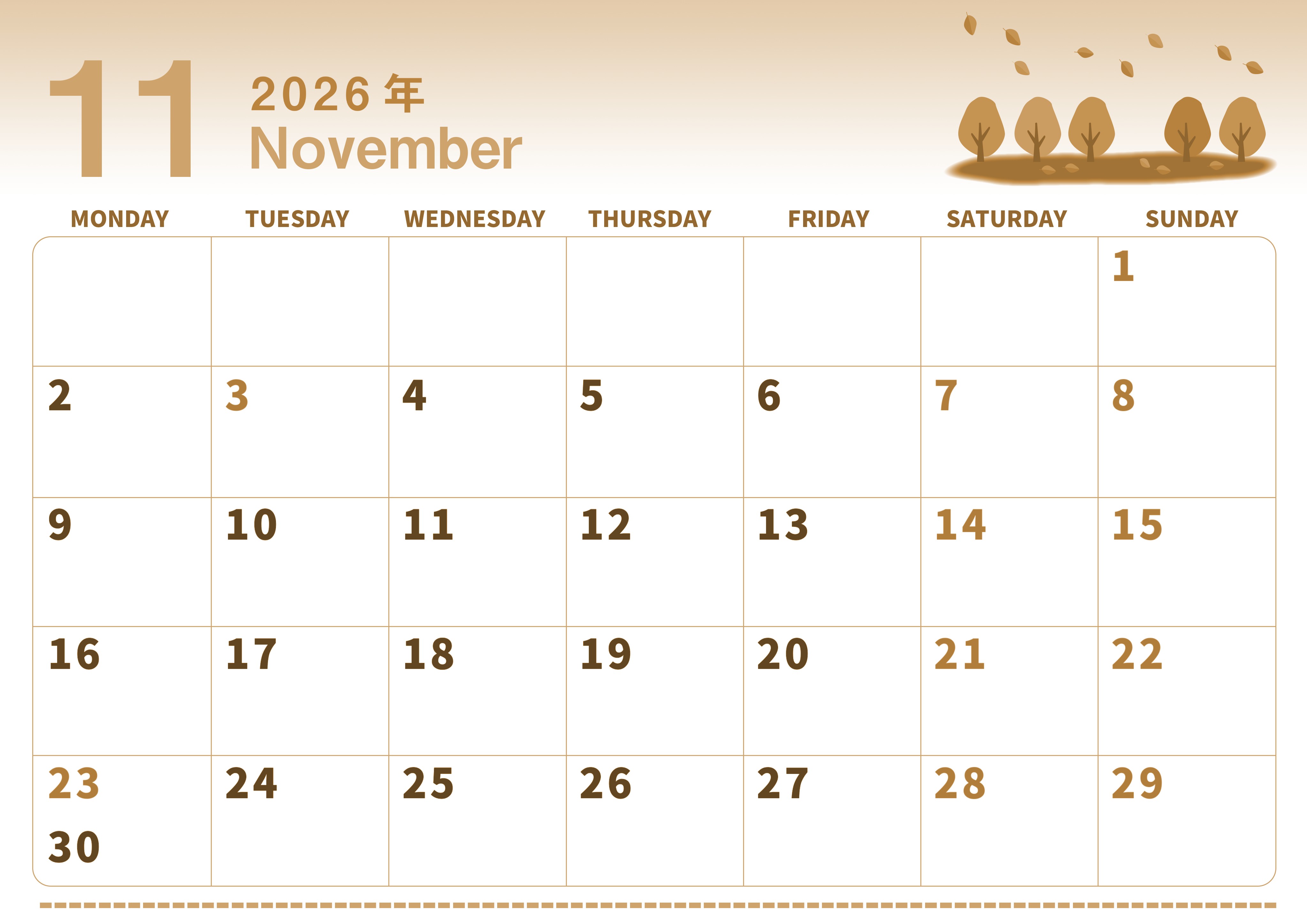 2026年・無料のカレンダーテンプレート 2026年11月横型レトロな月曜始まり 紅葉イラストのかわいいA4無料セピア調カレンダー(2026-00561101) 素材状デザイン王 2025年4月2日 2026年11月横型レトロな月曜始まりの無料テンプレートセピア調カレンダーです。紅葉を描いたかわいいイラストがおすすめポイントのフリー素材となっています。(2026-00561101) 11月 横型のカレンダー 月曜始まり セピア カレンダーデザイン-0056