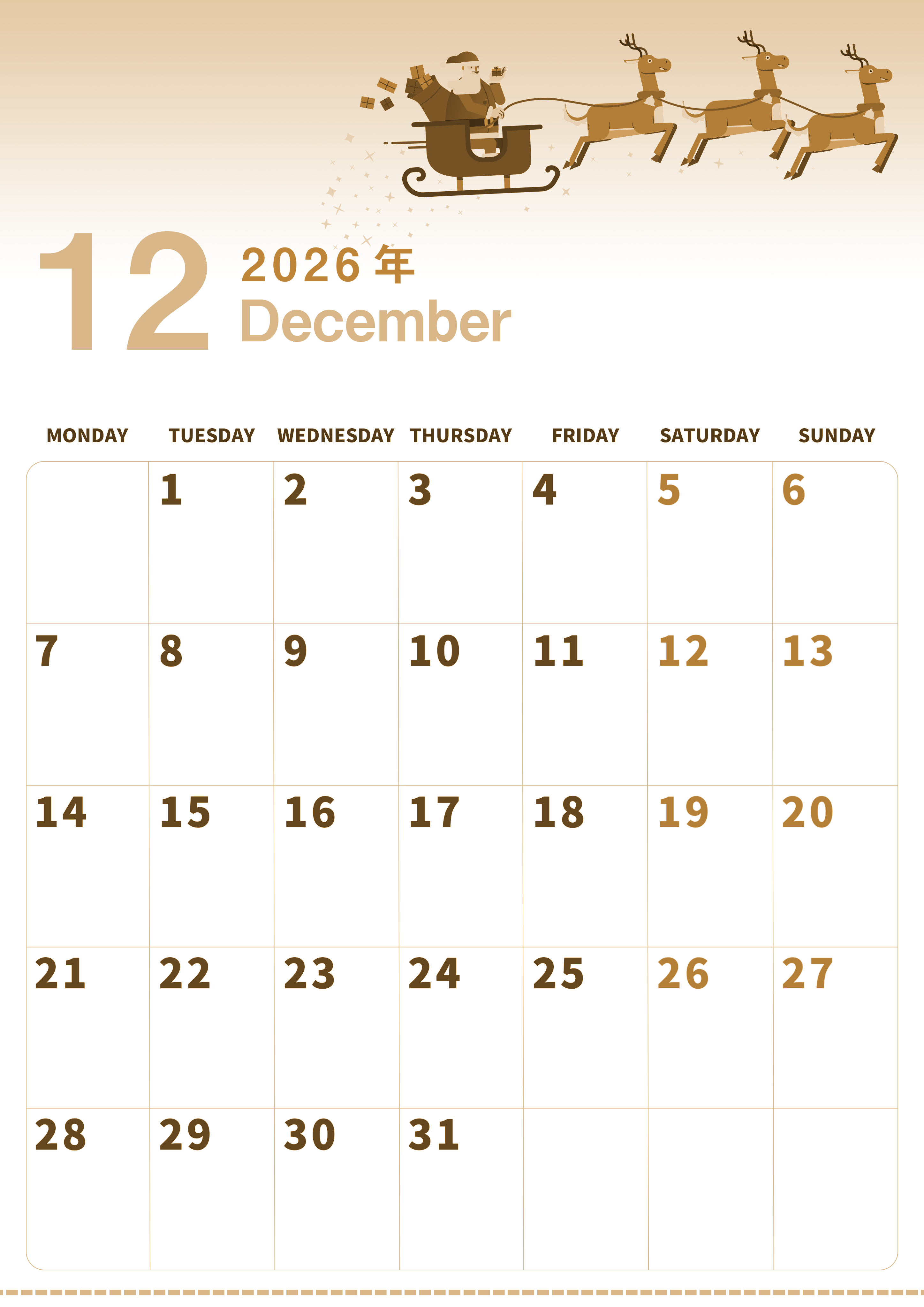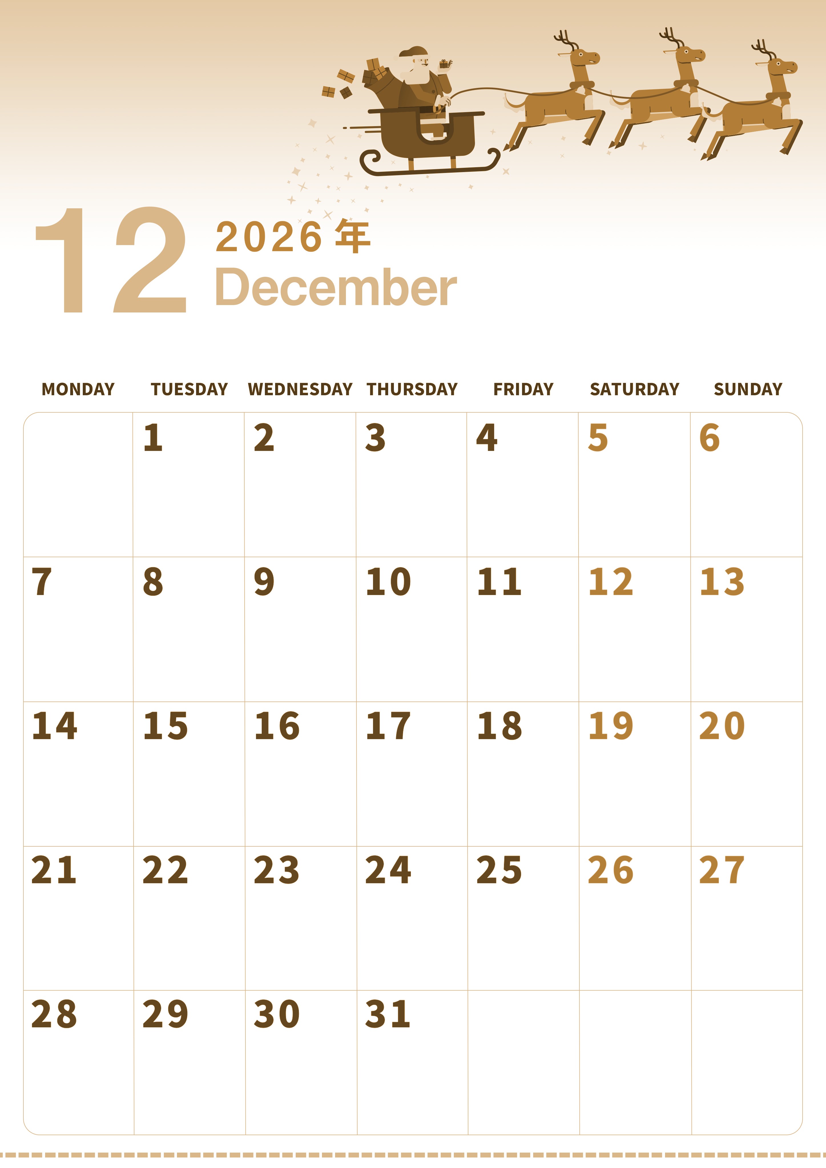 2026年12月縦型レトロな月曜始まりの無料テンプレートセピア調カレンダーです。トナカイとサンタクロースがクリスマスの雰囲気を表現しているかわいいイラストです。月曜始まりで予定の管理がしやすいフリー素材となっています。(2026-00561211)