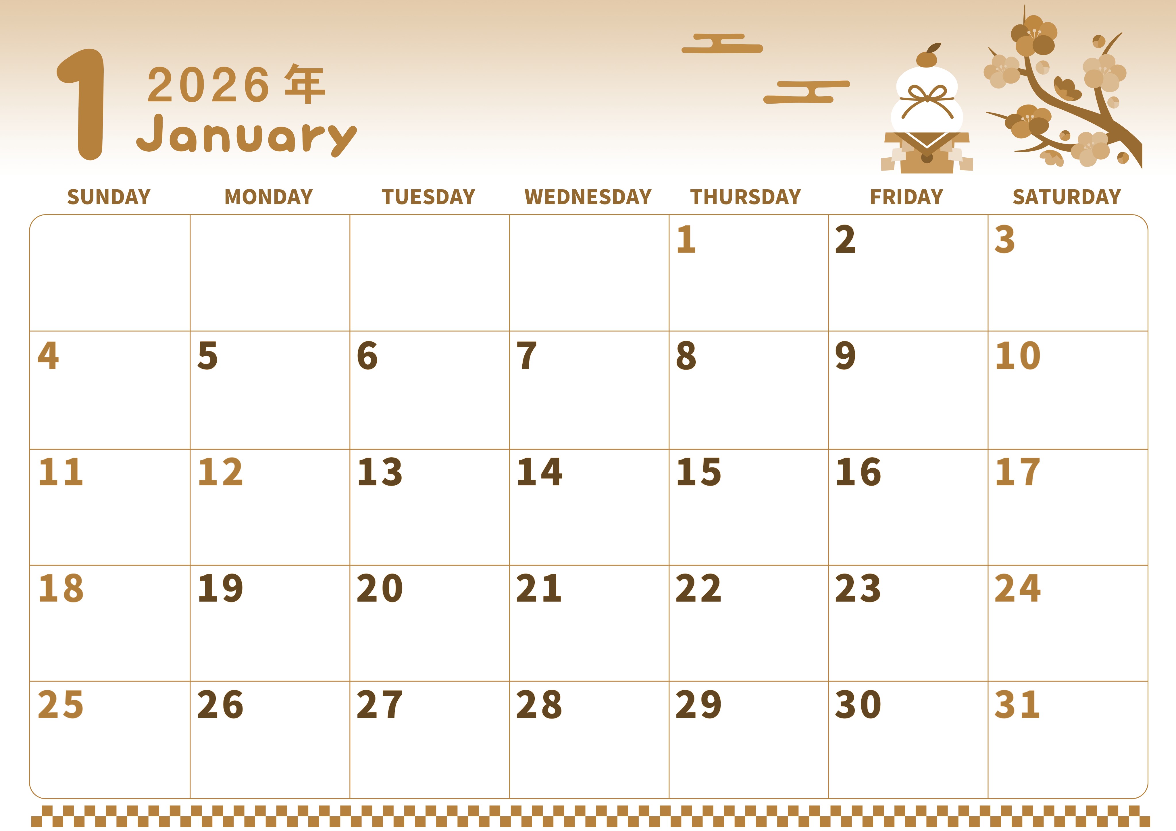 2026年1月横型レトロな日曜始まりセピア調カレンダーです。ポップで明るい鏡餅と梅の花のイラストをあしらいました。文字フォントは見やすいながらもぷにぷにした雰囲気でかわいいです。使いやすいサイズのセピア調カレンダーを試してみて下さい。(2026-00570100)