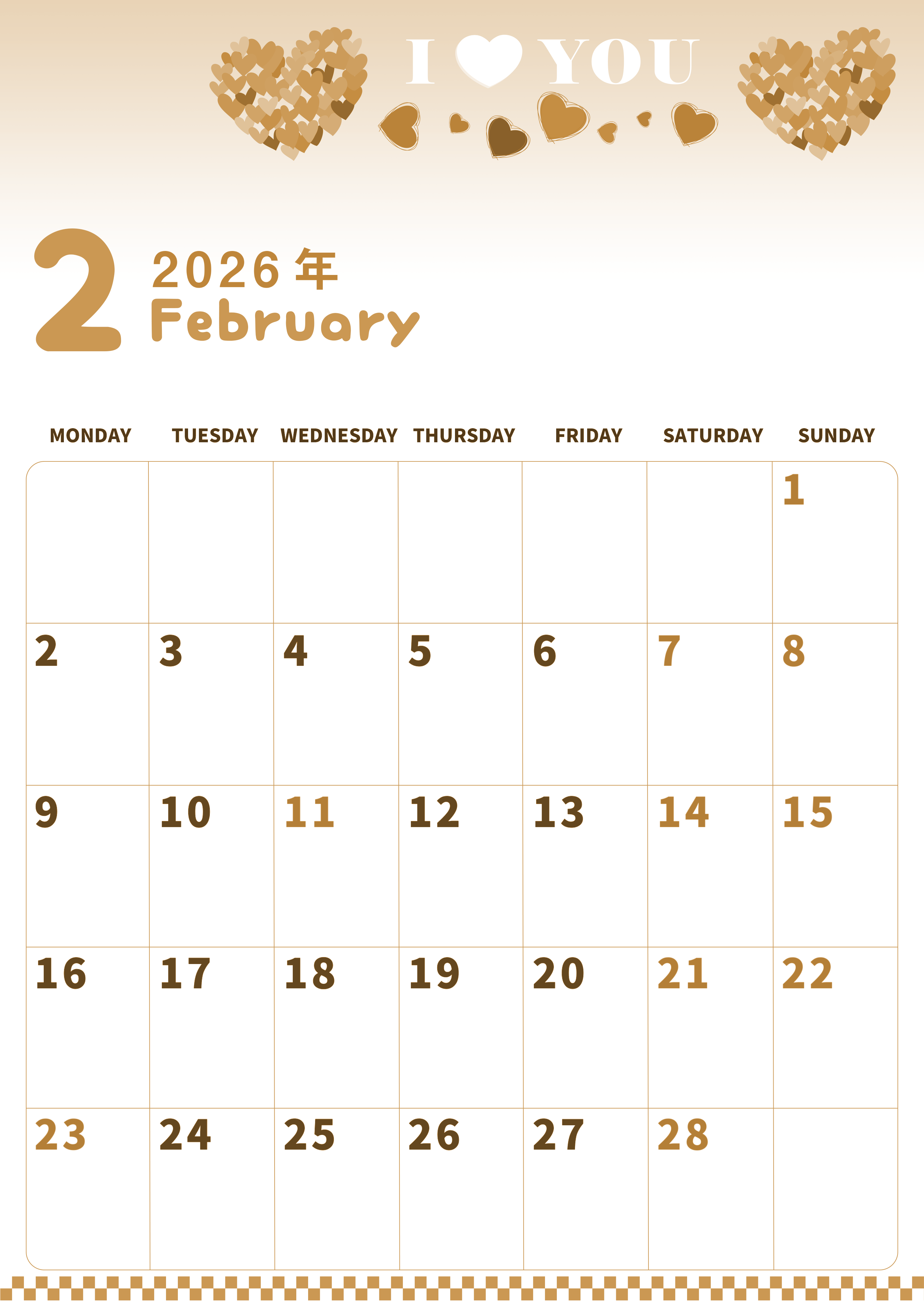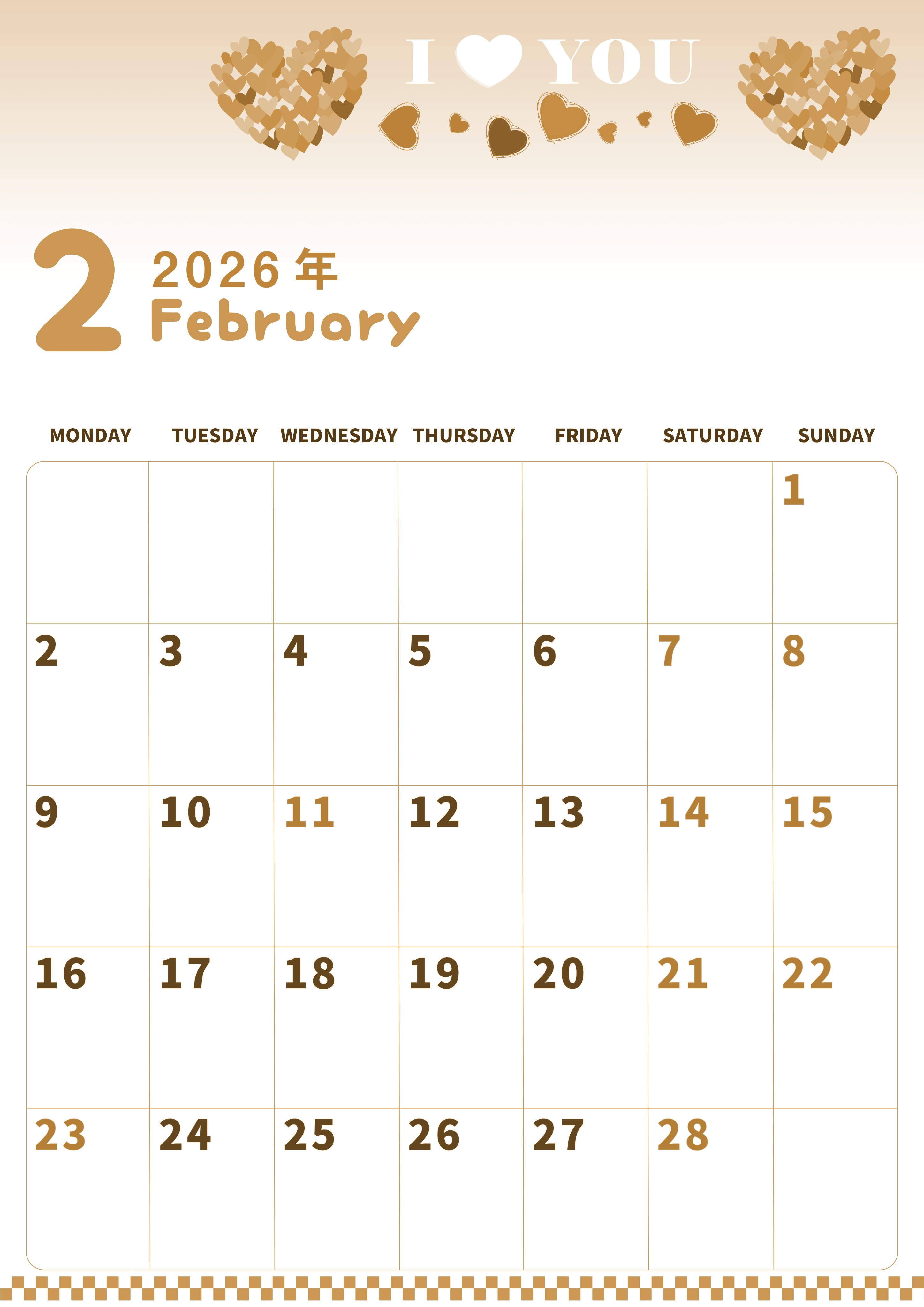 2026年2月縦型レトロな月曜始まりの無料テンプレートセピア調カレンダーです。ぷっくり文字がかわいい目を引くデザインの月曜始まりセピア調カレンダーです。フリー素材でありながらハートのデザインは細部まで凝っています。(2026-00570211)
