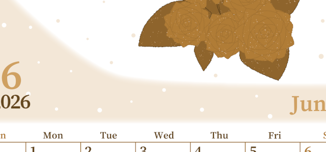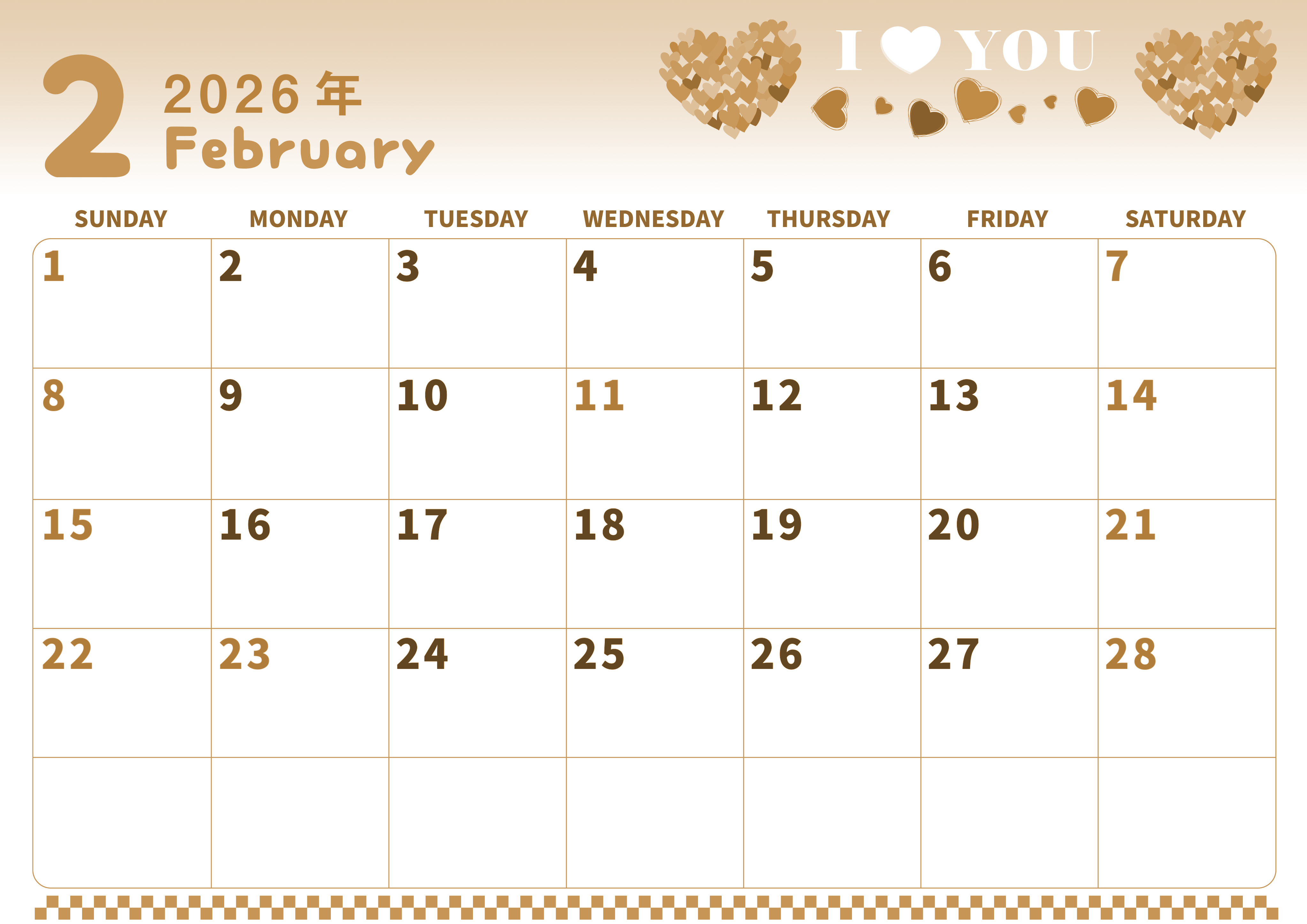 2026年2月横型レトロな日曜始まりの無料テンプレートセピア調カレンダーです。たっぷりの小さなハートが集まって大きなひとつのハートができあがっているガーリーかつおしゃれ心のあるかわいいイラストセピア調カレンダーです。(2026-00570200)