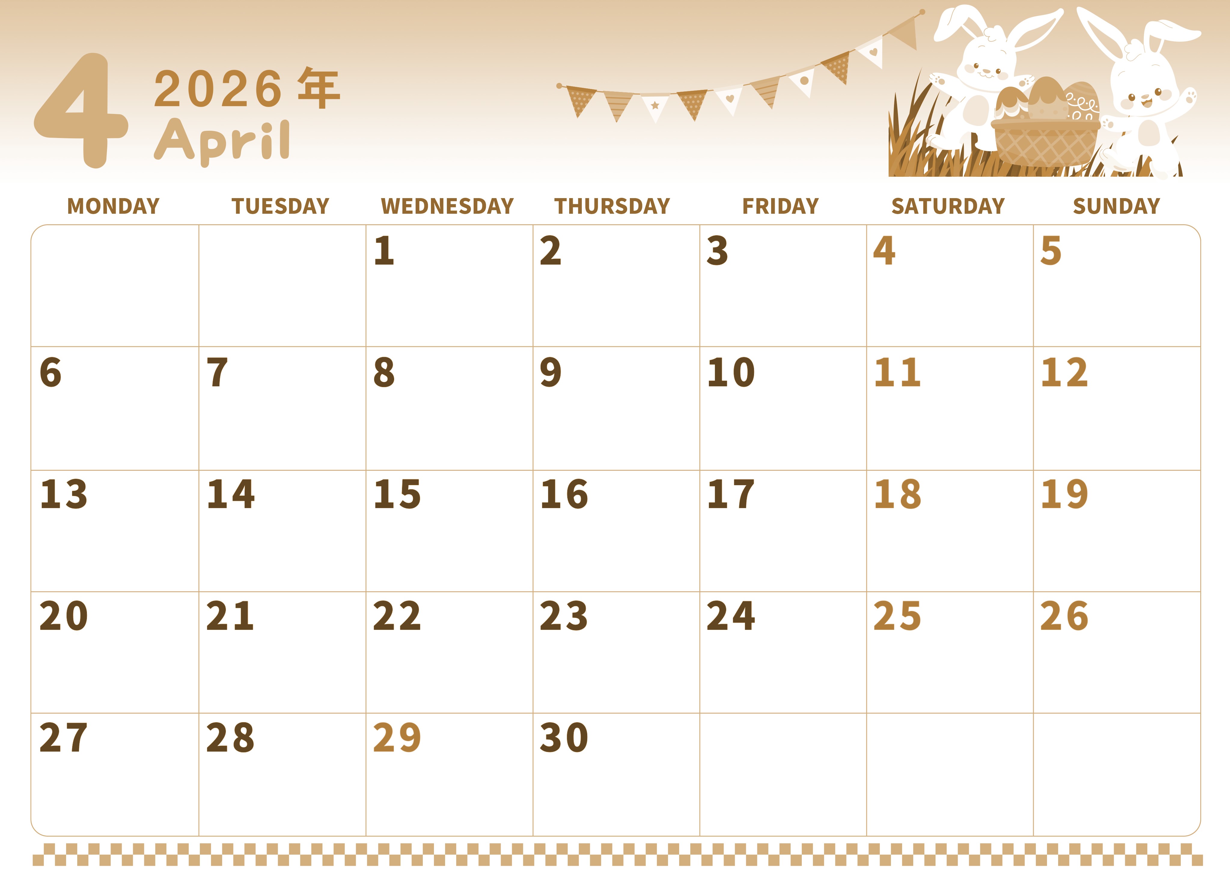 2026年4月横型レトロな月曜始まりの無料テンプレートセピア調カレンダーです。イースターをメインテーマにしたかわいいポップなセピア調カレンダーです。月曜始まりで手書きで予定を書き込みできるレイアウトとなっています。(2026-00570401)