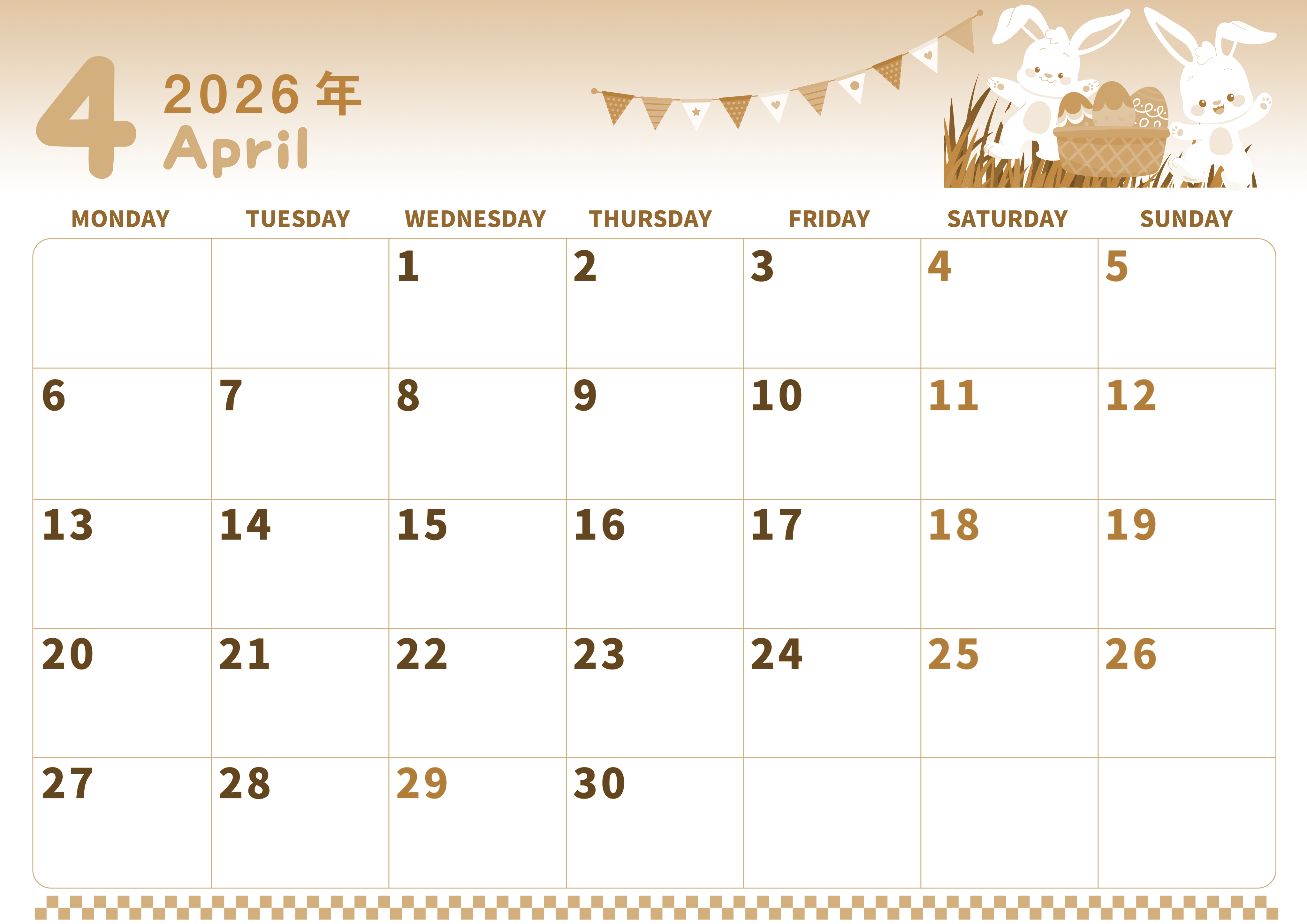 2026年4月横型レトロな月曜始まり イースターイラストのかわいいA4無料セピア調カレンダー(2026-00570401)