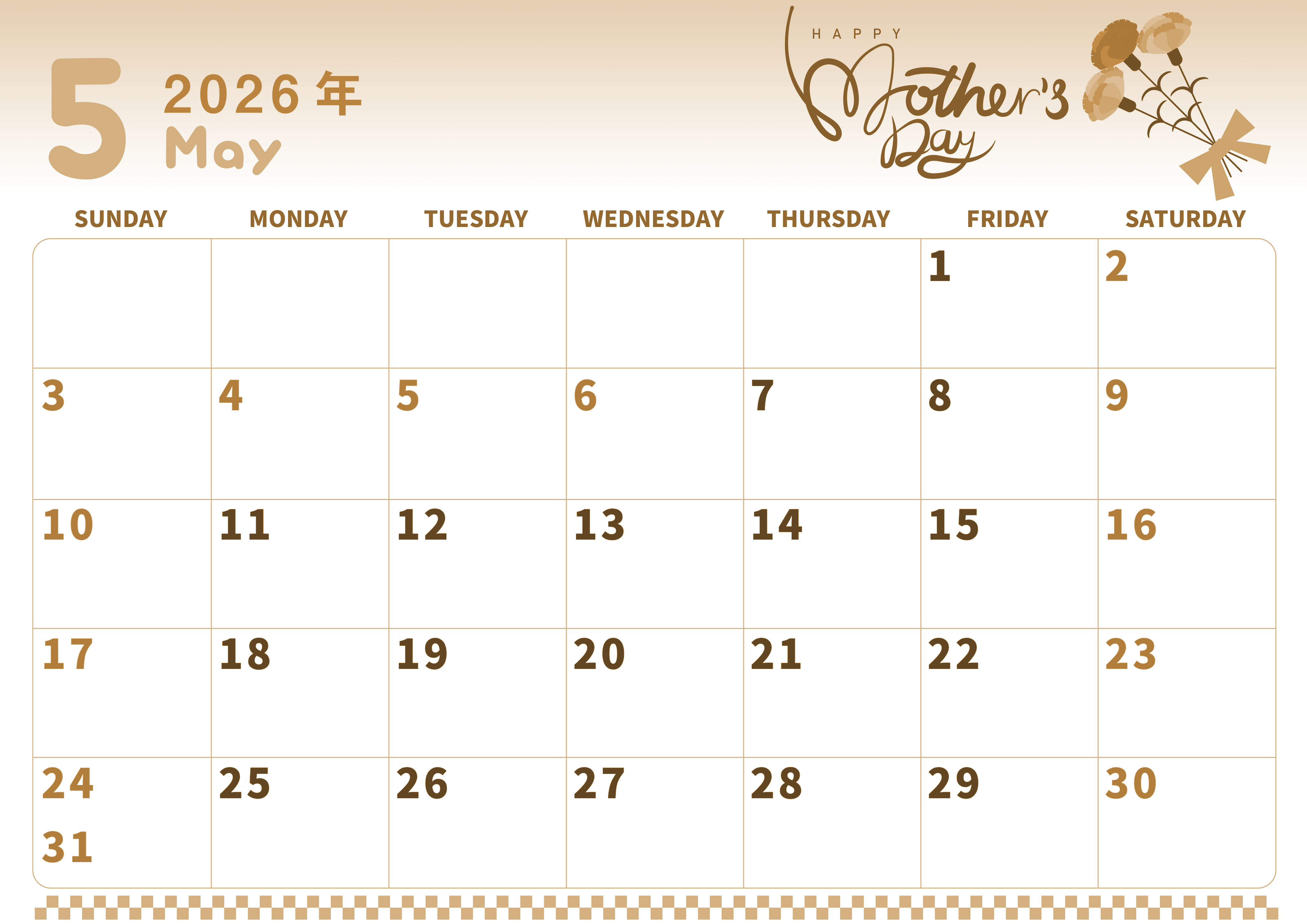2026年5月横型レトロな日曜始まりの無料テンプレートセピア調カレンダーです。母の日をテーマにした心がほっこりと温かくなるようなやさしいかわいいデザインのイラストセピア調カレンダーです。カーネーションがワンポイントです。(2026-00570500)