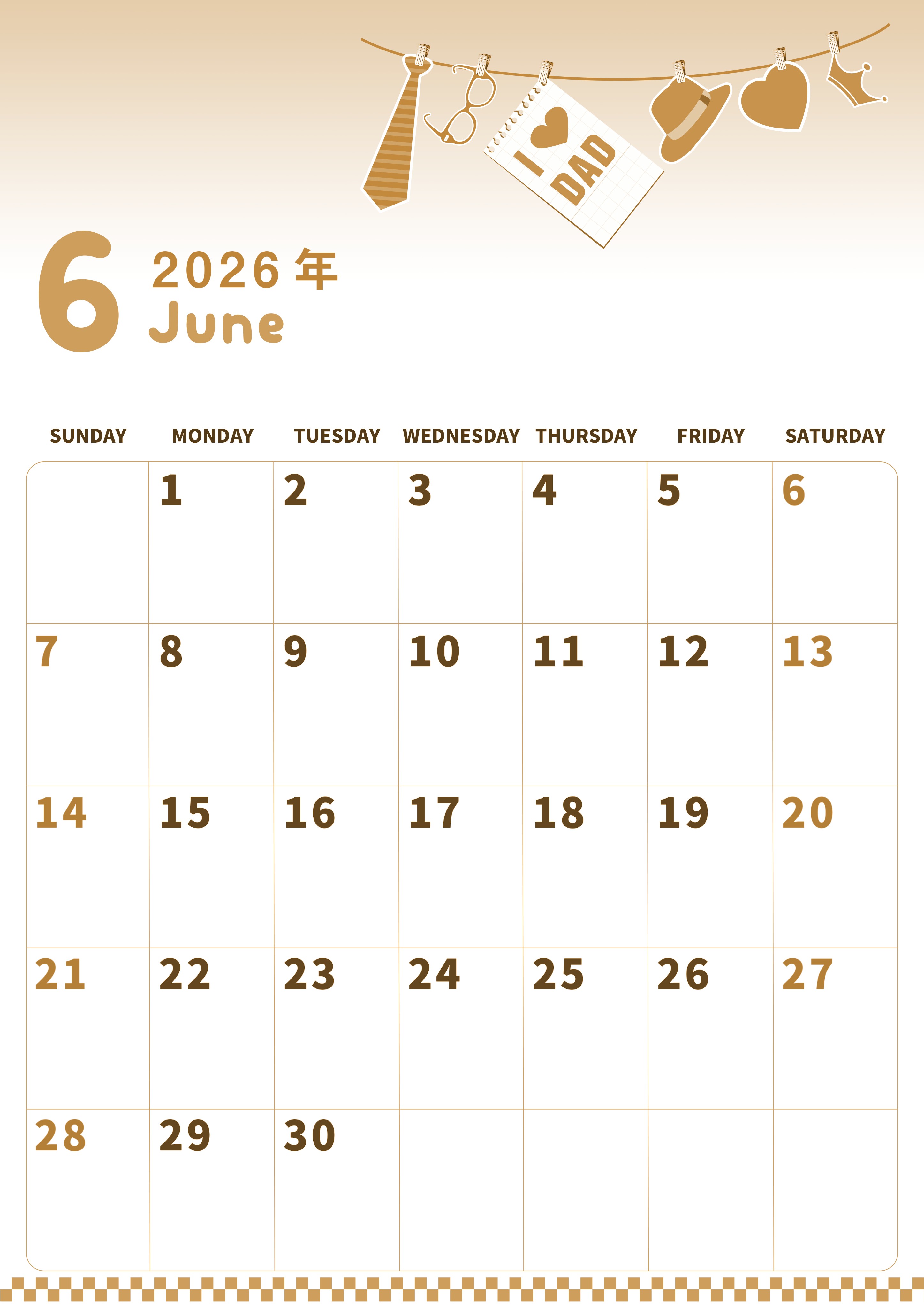 2026年6月縦型レトロな日曜始まりの無料テンプレートセピア調カレンダーです。6月には父の日があります。普段お世話になっているお父さんに対する感謝の気持ちがこもったかわいいイラストセピア調カレンダーです。(2026-00570610)