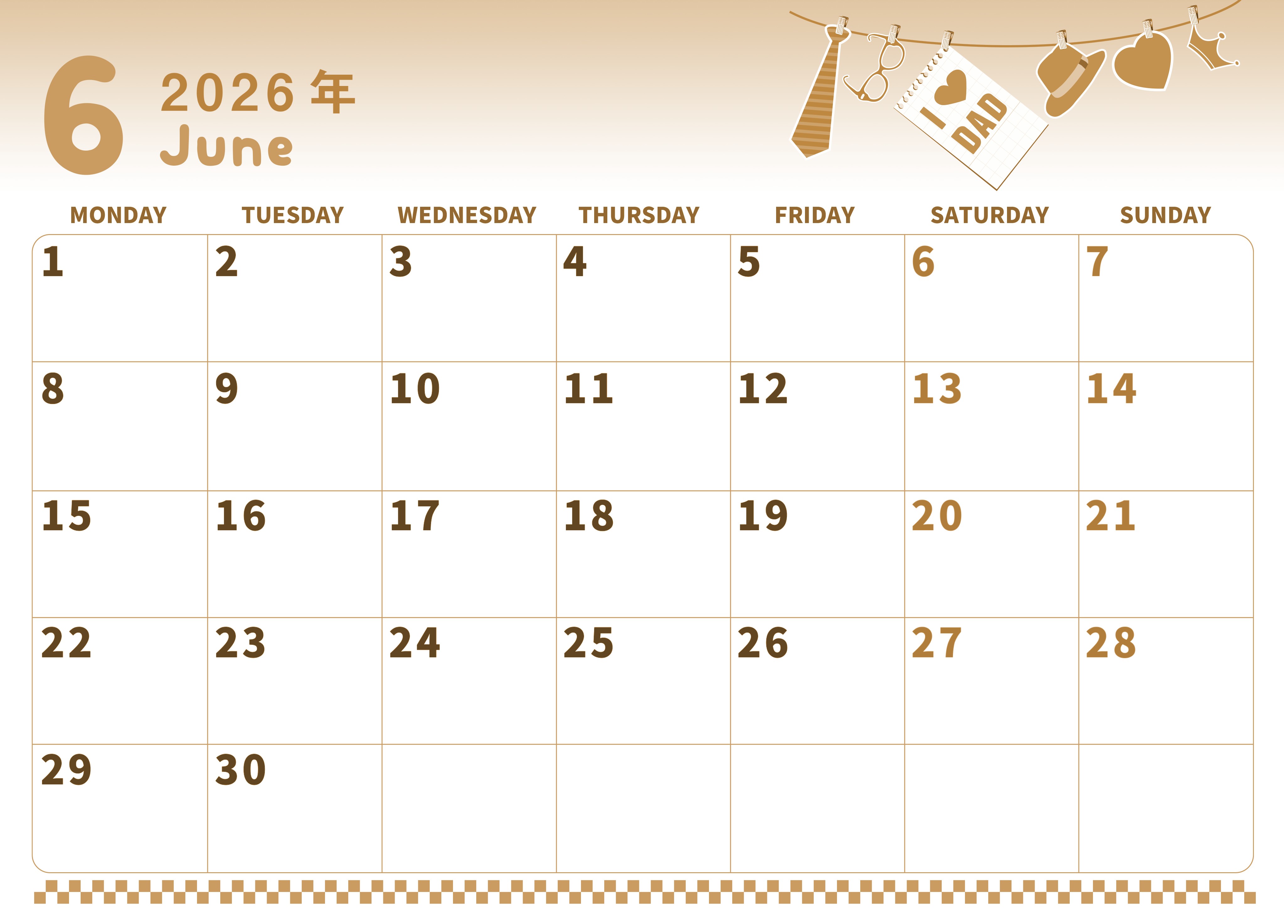 2026年6月横型レトロな月曜始まりの無料テンプレートセピア調カレンダーです。父の日にちなんだイラストがポップでかわいい月曜始まりのセピア調カレンダーは曜日によって日にちの色分けがされているので見やすい構成になっています。(2026-00570601)