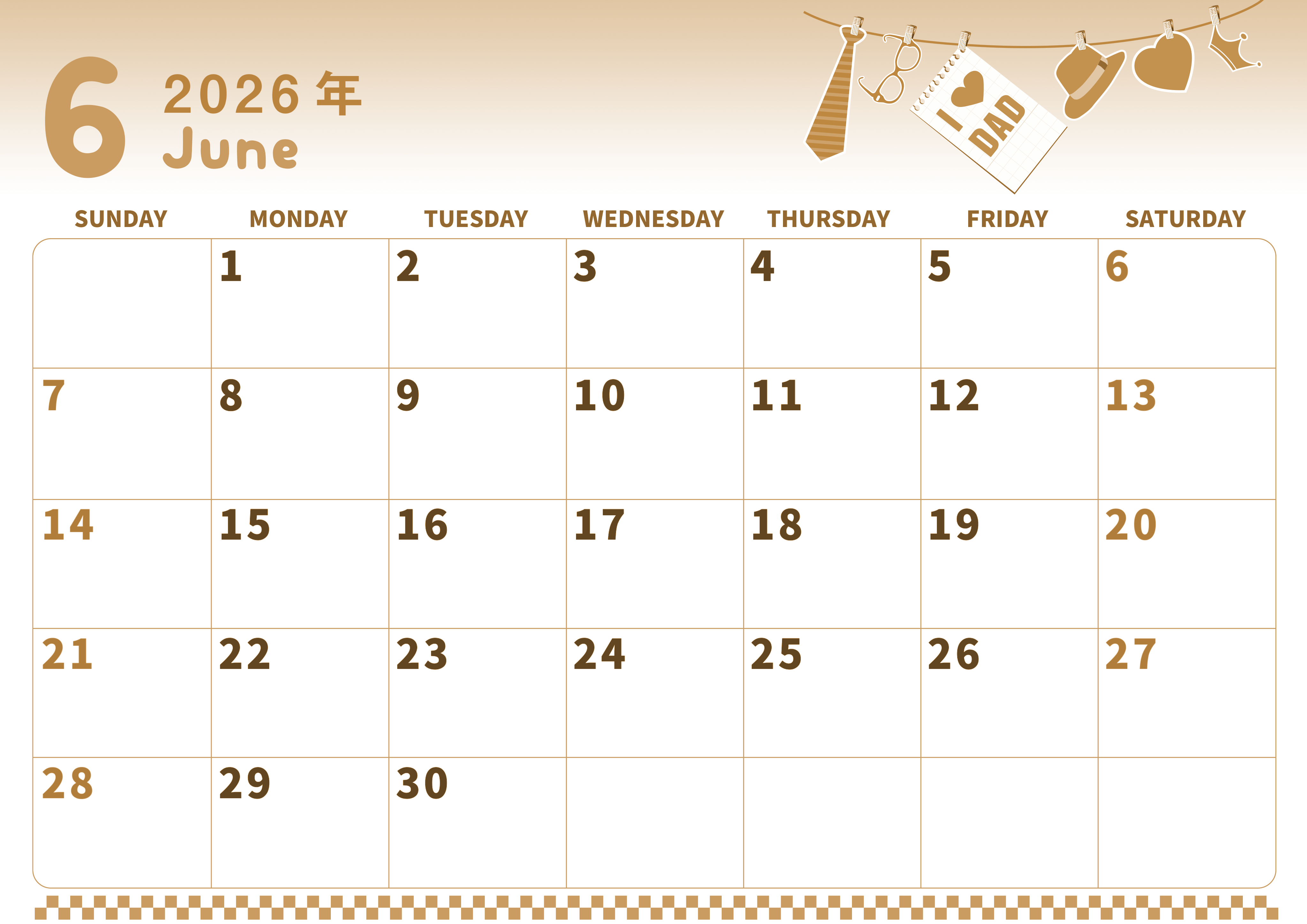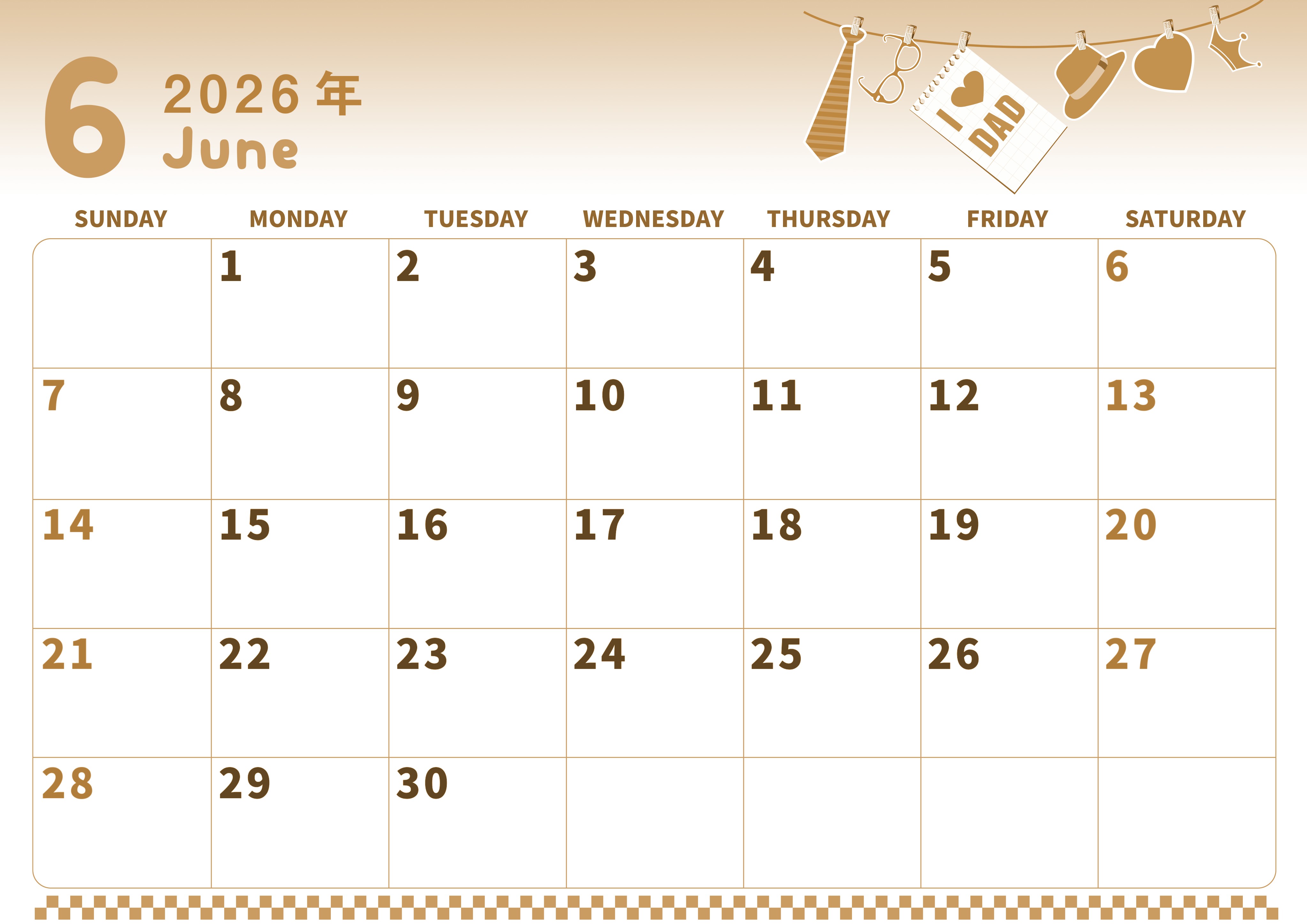 2026年・無料のカレンダーテンプレート 2026年6月横型レトロな日曜始まり 父の日イラストのかわいいA4無料セピア調カレンダー(2026-00570600) 素材状デザイン王 2025年4月2日 2026年6月横型レトロな日曜始まりの無料テンプレートセピア調カレンダーです。父の日にちなんだお父さんにプレゼントをすると喜ばれそうなアイテムのイラストがかわいいセピア調カレンダーです。(2026-00570600) 6月 横型のカレンダー 日曜始まり セピア カレンダーデザイン-0057