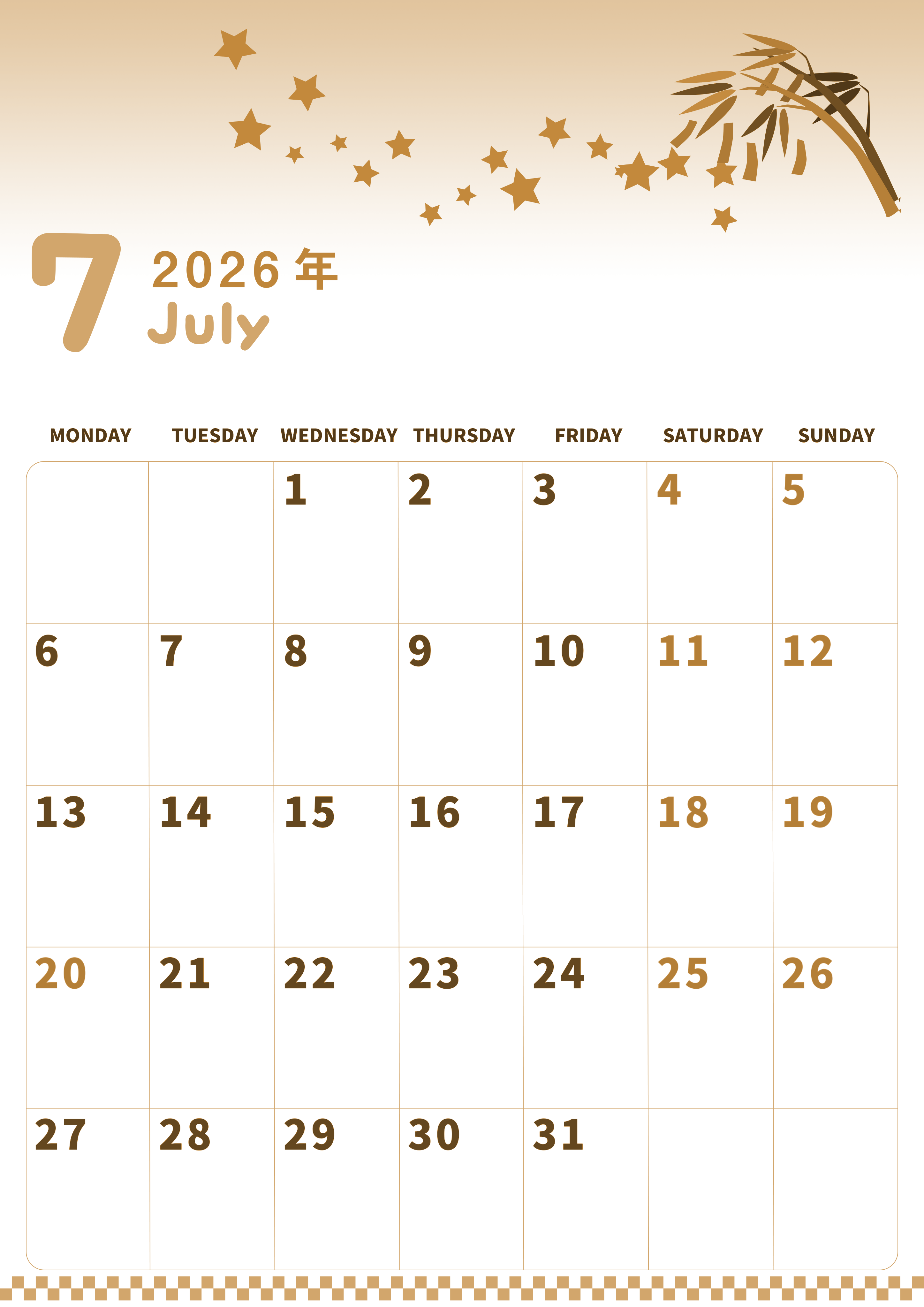 2026年7月縦型レトロな月曜始まりの無料テンプレートセピア調カレンダーです。セピア調カレンダーは月曜始まりにこだわっているという人にダウンロードをおすすめしたいかわいいイラストが推しポイントのコンテンツです。(2026-00570711)