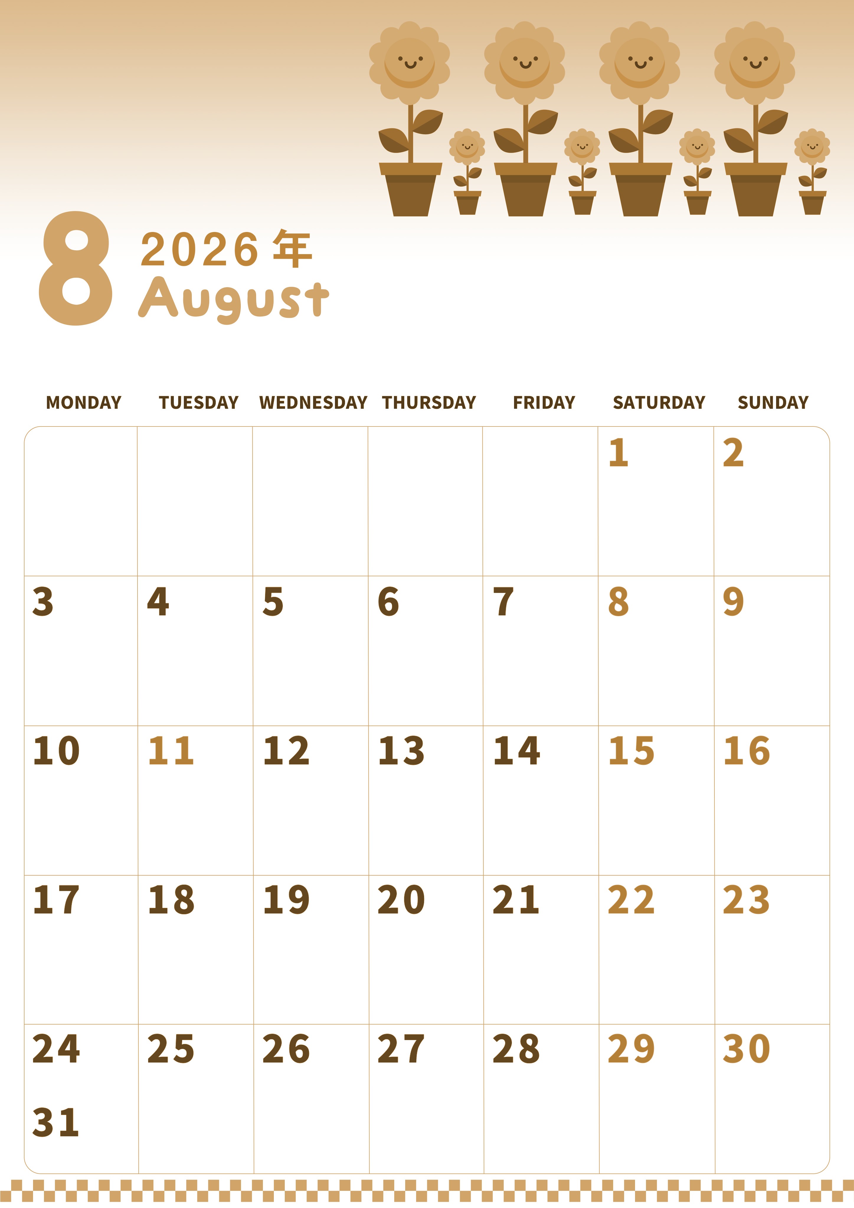 2026年8月縦型レトロな月曜始まりの無料テンプレートセピア調カレンダーです。月曜始まりのセピア調カレンダーが使いたいという人におすすめです。イラストは季節の花であるヒマワリをポップに描き上げていてかわいいです。(2026-00570811)