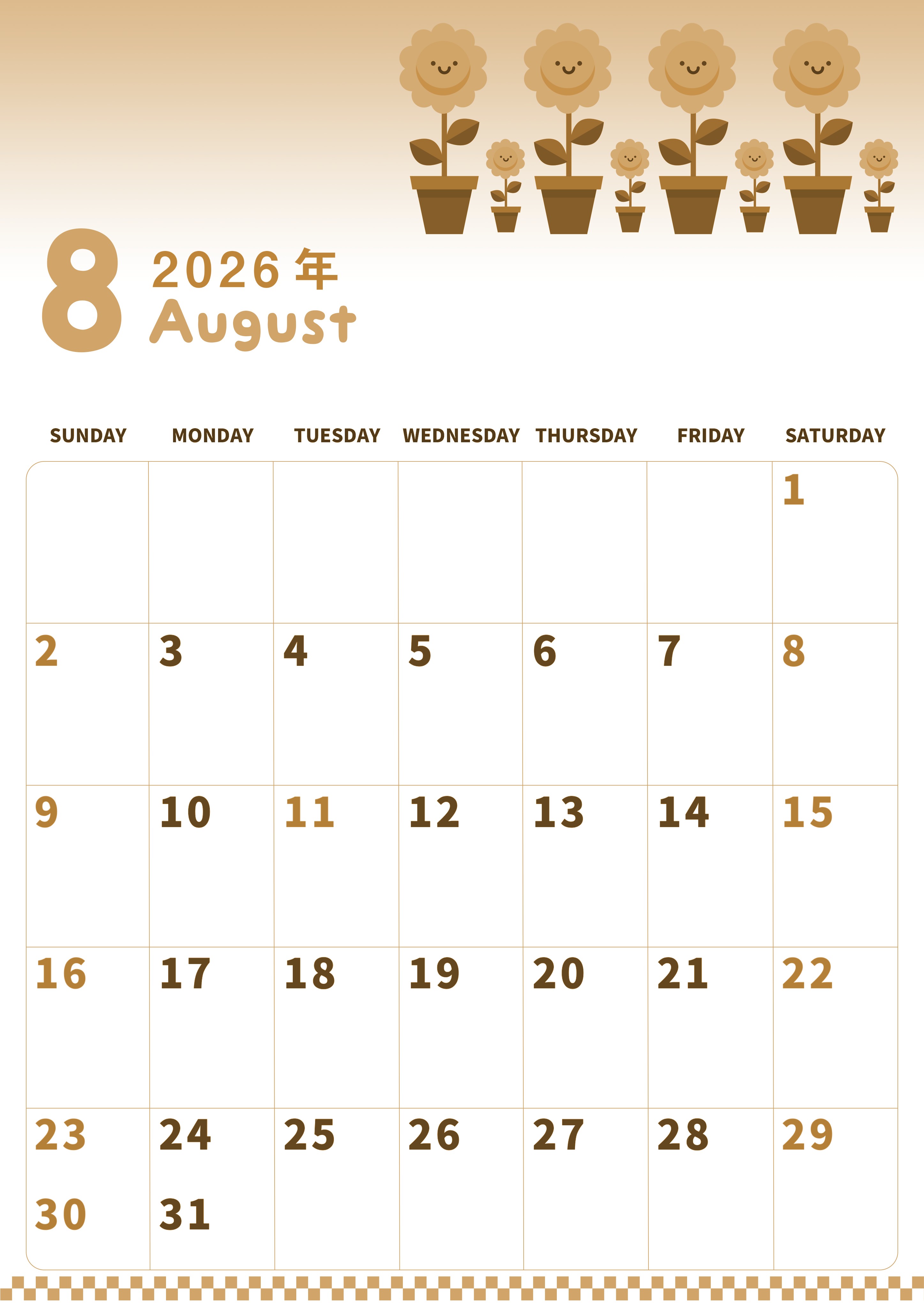 2026年8月縦型レトロな日曜始まりの無料テンプレートセピア調カレンダーです。笑顔でポジティブな生命力を感じさせる季節の花であるヒマワリのイラストがかわいいです。オリジナルデザインで無料素材です。(2026-00570810)