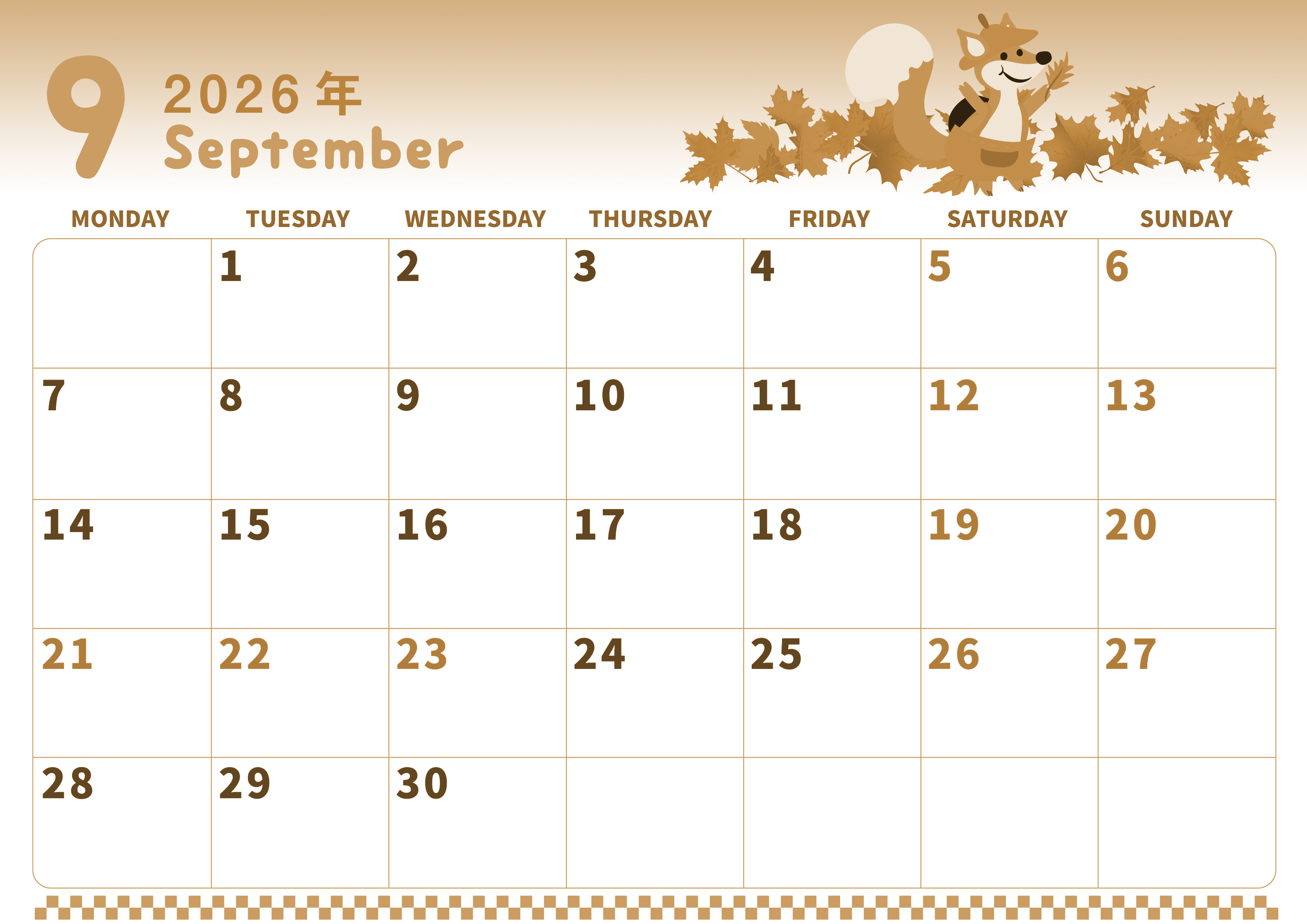 2026年9月横型レトロな月曜始まりの無料テンプレートセピア調カレンダーです。子狐がるんるんしているかわいいイラストです。月曜始まりなので予定がたっぷりで忙しい人も時間管理がしやすいレイアウトです。(2026-00570901)