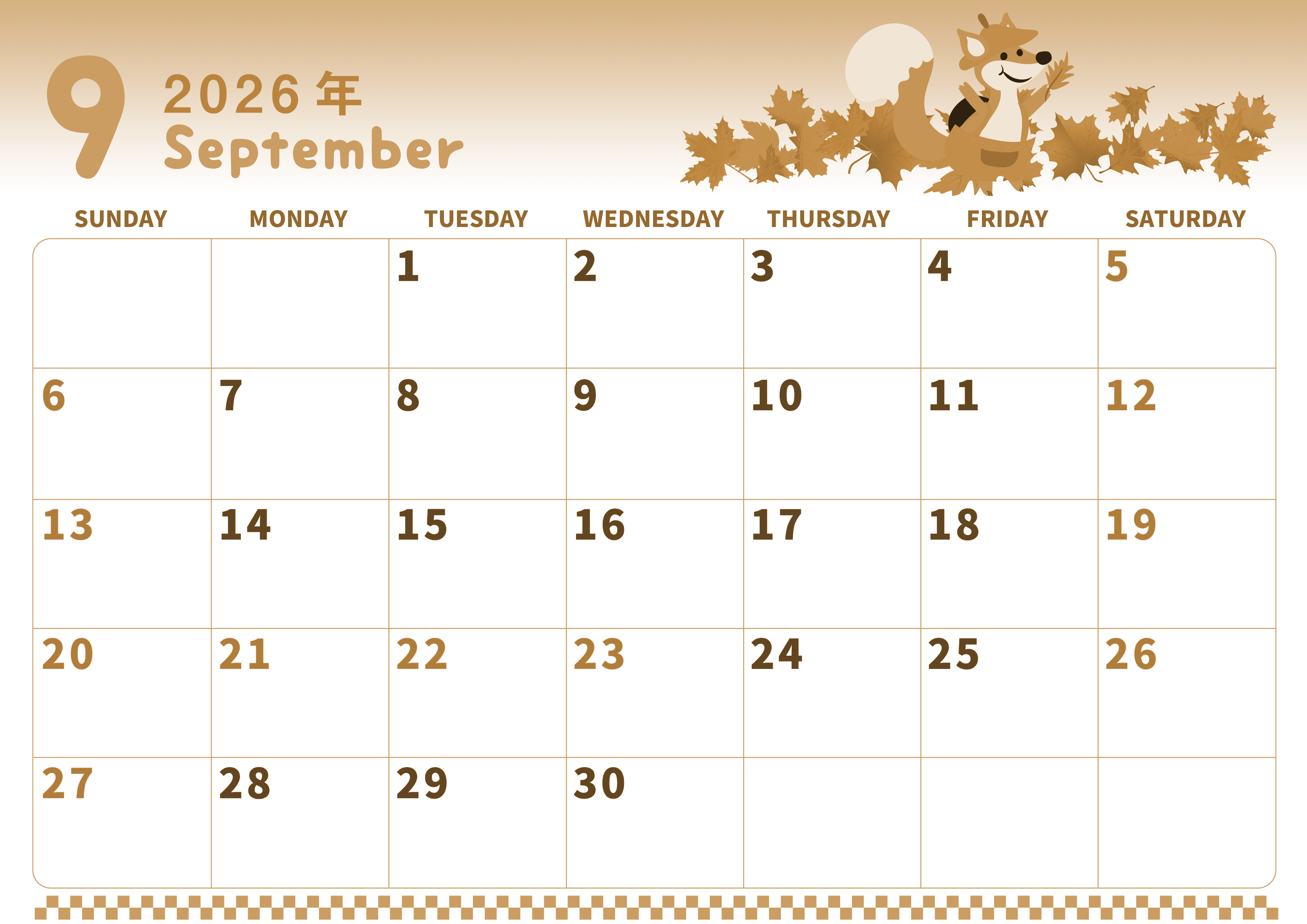 2026年9月横型レトロな日曜始まりの無料テンプレートセピア調カレンダーです。子狐がもみじをかき集めた山の前でダンスをしている様子を描いたとてもかわいいイラストがおすすめポイントのデザインに仕上がっています。(2026-00570900)
