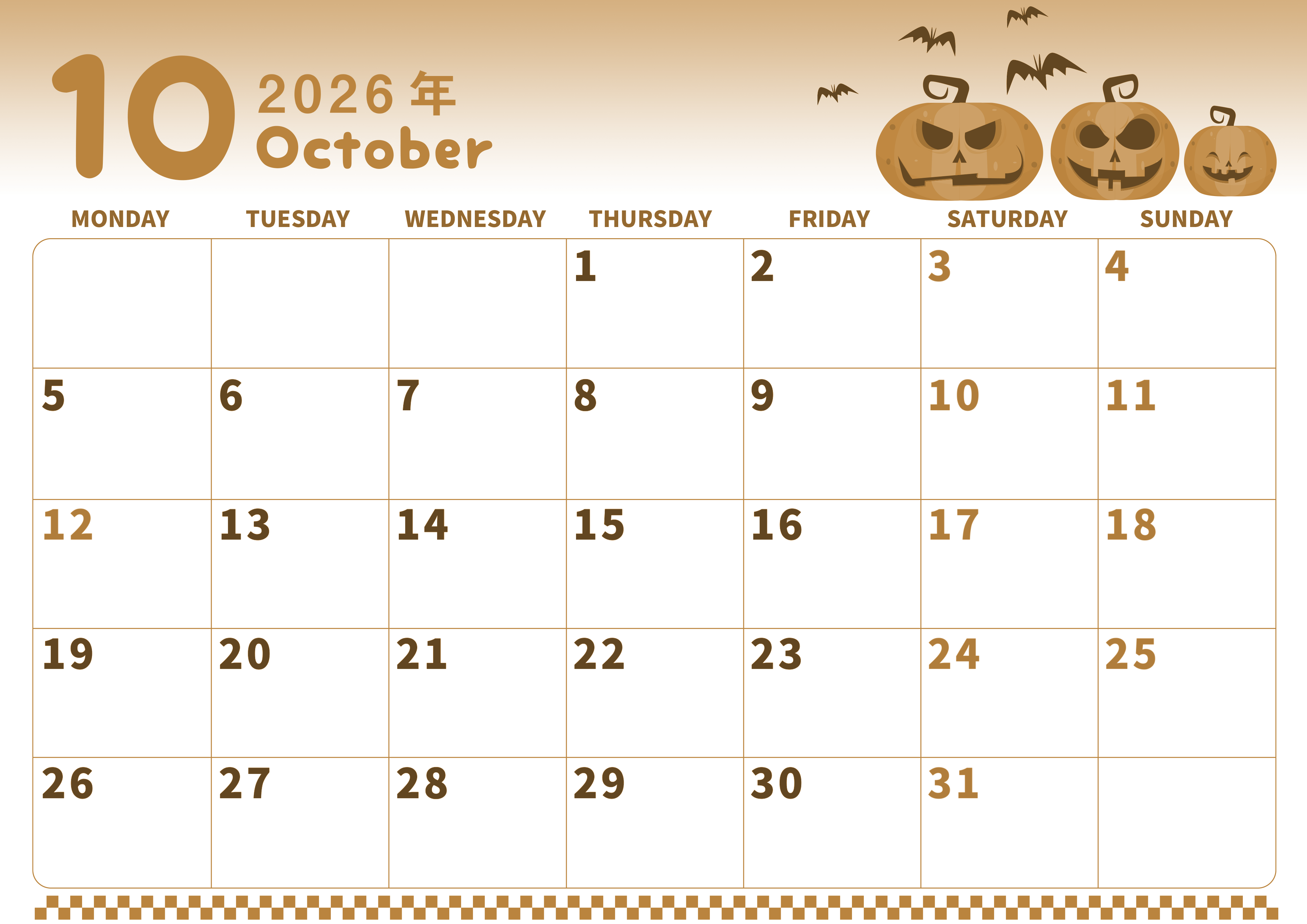 2026年10月横型レトロな月曜始まりの無料テンプレートセピア調カレンダーです。ハロウィンのカボチャが並んでいるイラストです。ぷにっとした文字のデザインがとてもかわいいので毎日の予定を書き込むモチベーションが上がります。(2026-00571001)