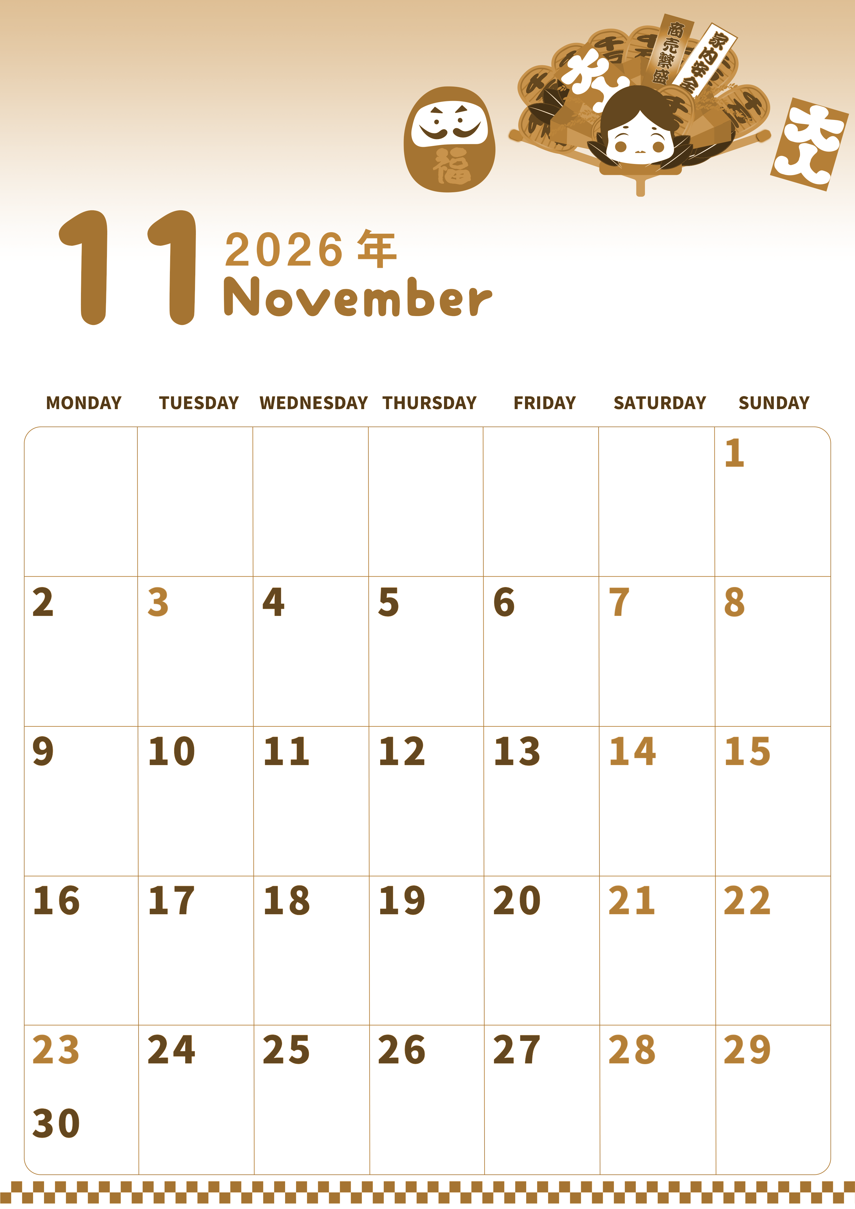 2026年11月縦型レトロな月曜始まりの無料テンプレートセピア調カレンダーです。だるまが主役のイラストです。セピア調カレンダー全体の雰囲気もとてもかわいいので予定を管理するモチベーションアップに繋がります。(2026-00571111)