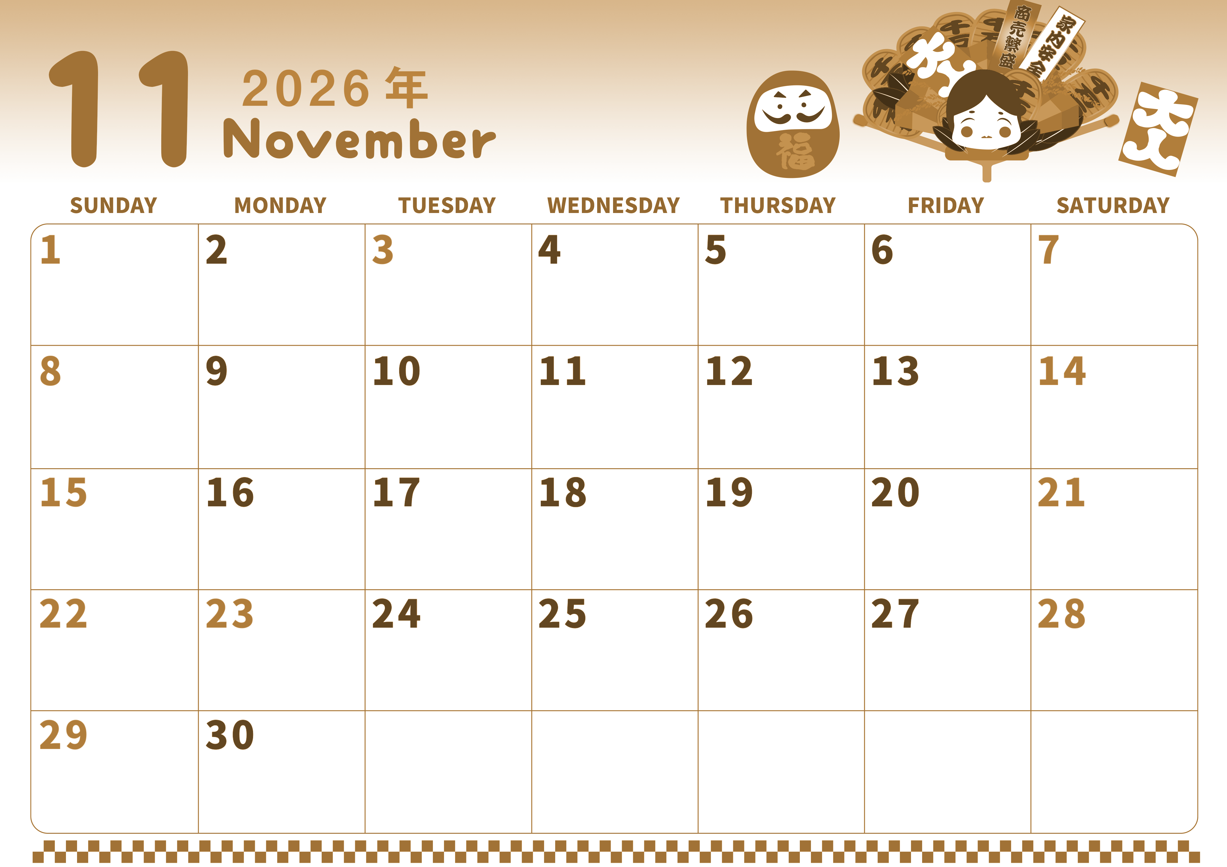 2026年・無料のカレンダーテンプレート 2026年11月横型レトロな日曜始まり だるまイラストのかわいいA4無料セピア調カレンダー(2026-00571100) 素材状デザイン王 2025年4月2日 2026年11月横型レトロな日曜始まりの無料テンプレートセピア調カレンダーです。だるまとおかめのコンビネーションがかわいいイラストです。11月の文字はくっきりはっきりとしていて目立ちます。(2026-00571100) 11月 横型のカレンダー 日曜始まり セピア カレンダーデザイン-0057