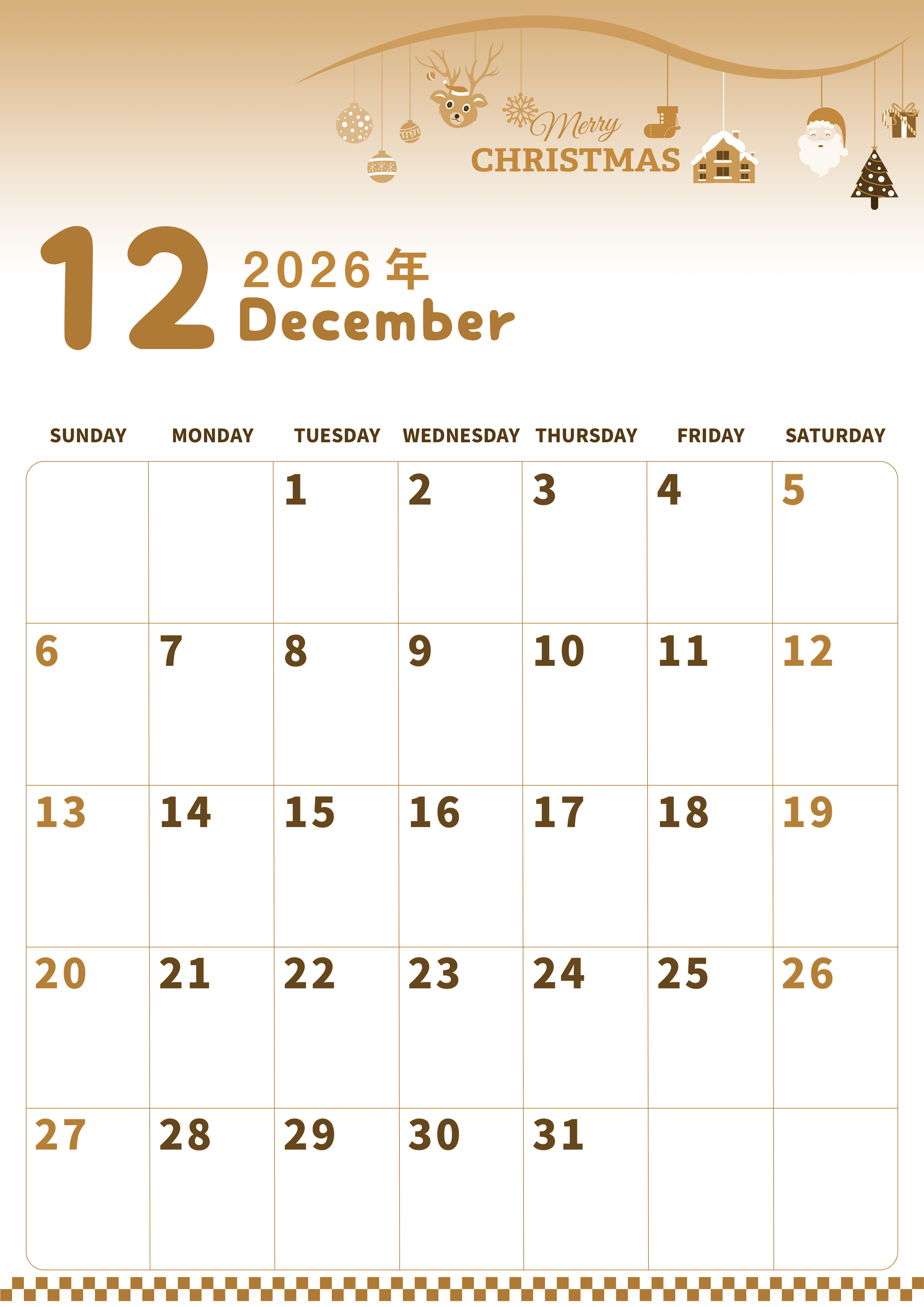 2026年12月縦型レトロな日曜始まりの無料テンプレートセピア調カレンダーです。小さなオーナメントが沢山並んでいる様子が賑やかで冬の寒さを癒してくれるイラストです。全体的にかわいい世界観なのでおすすめです。(2026-00571210)