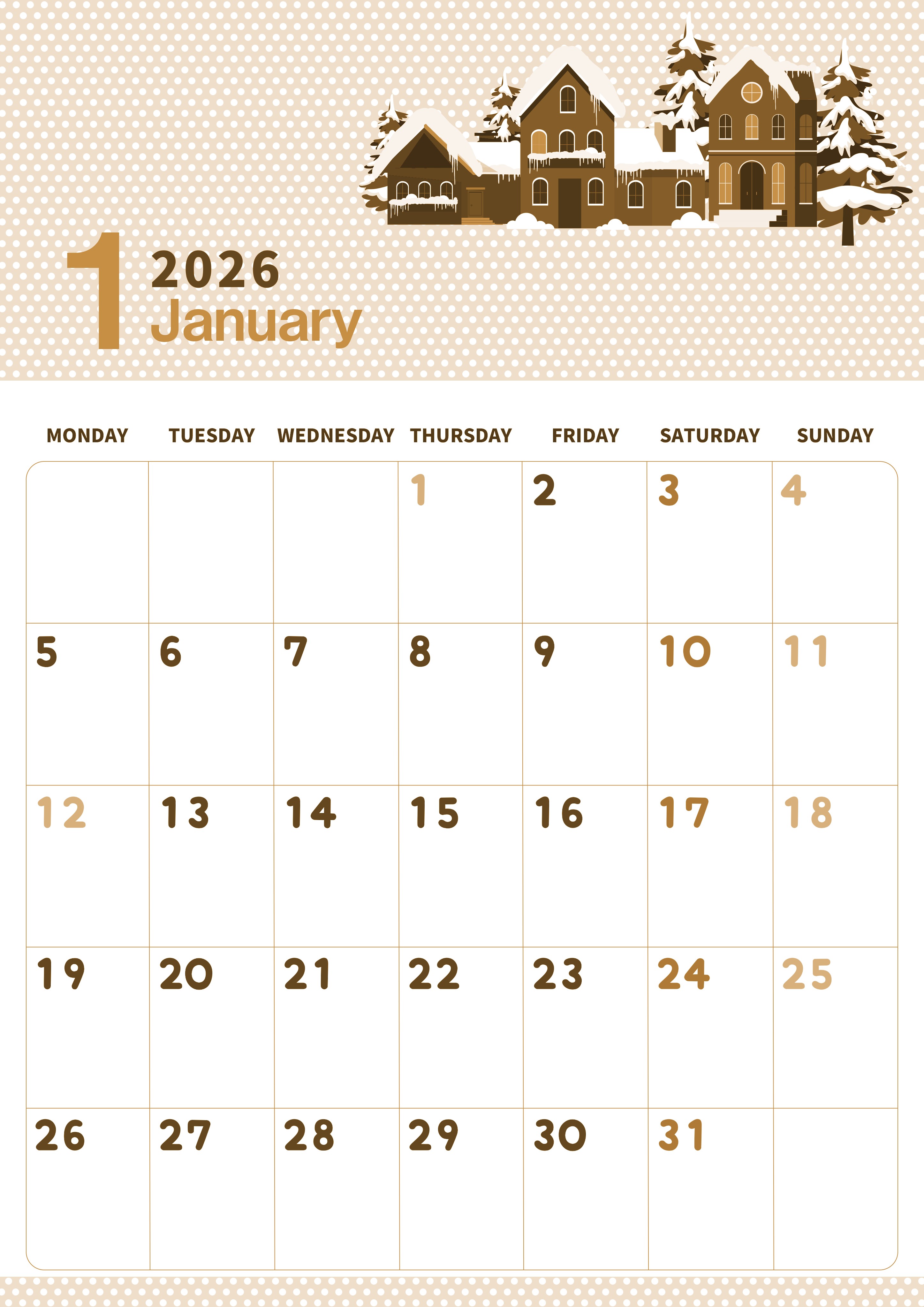 2026年1月縦型レトロな月曜始まりセピア調カレンダーです。イラスト部分の背景は白の水玉模様を採用しているのでべた塗りとは違って細部にこだわりがあるおしゃれなデザインのセピア調カレンダーに仕上がっています。北欧の雰囲気が好きな方におすすめです。(2026-00580111)