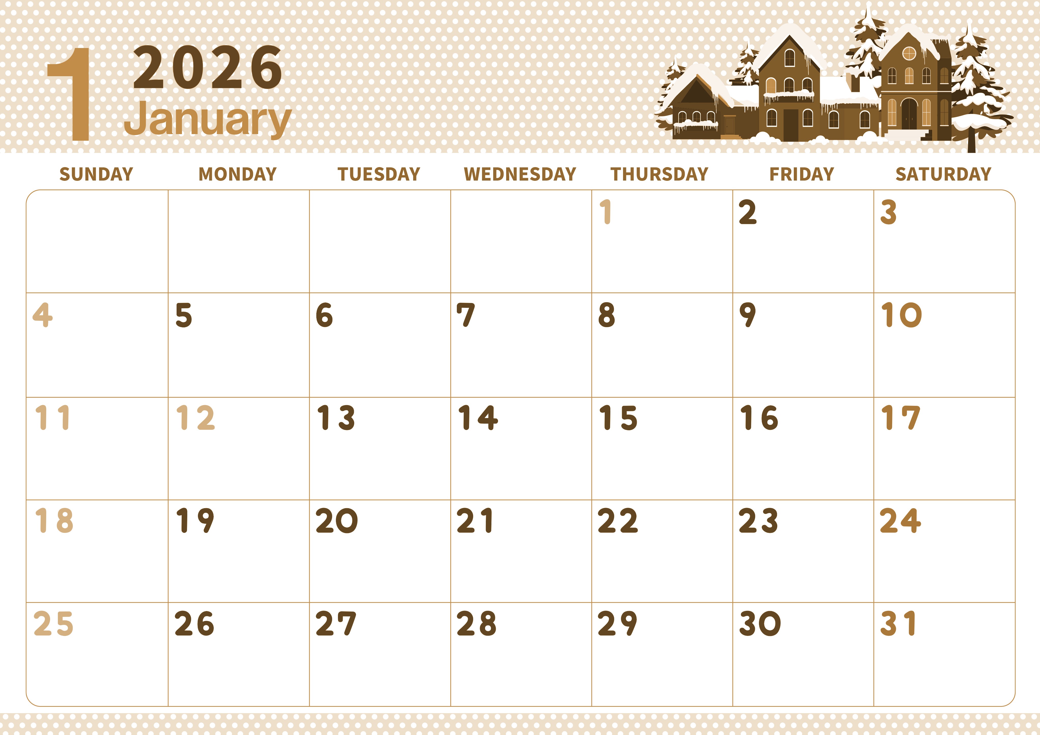 2026年1月横型レトロな日曜始まり 雪景色イラストのおしゃれA4無料セピア調カレンダー(2026-00580100)