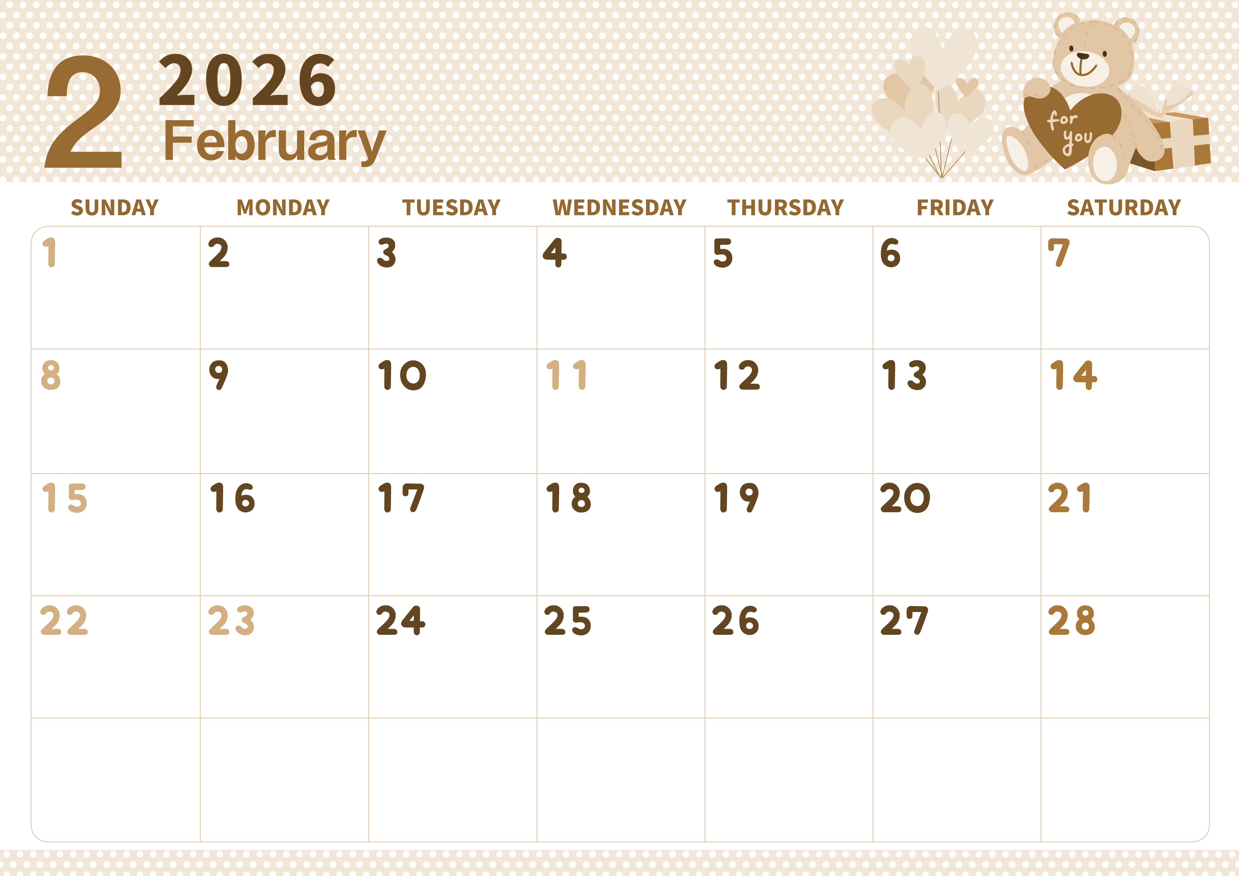 2026年2月横型レトロな日曜始まりの無料テンプレートセピア調カレンダーです。テディベアが大事そうにハートを抱きしめている癒し系のおしゃれなイラストです。バレンタインシーズンに無料セピア調カレンダーをどうぞ。(2026-00580200)